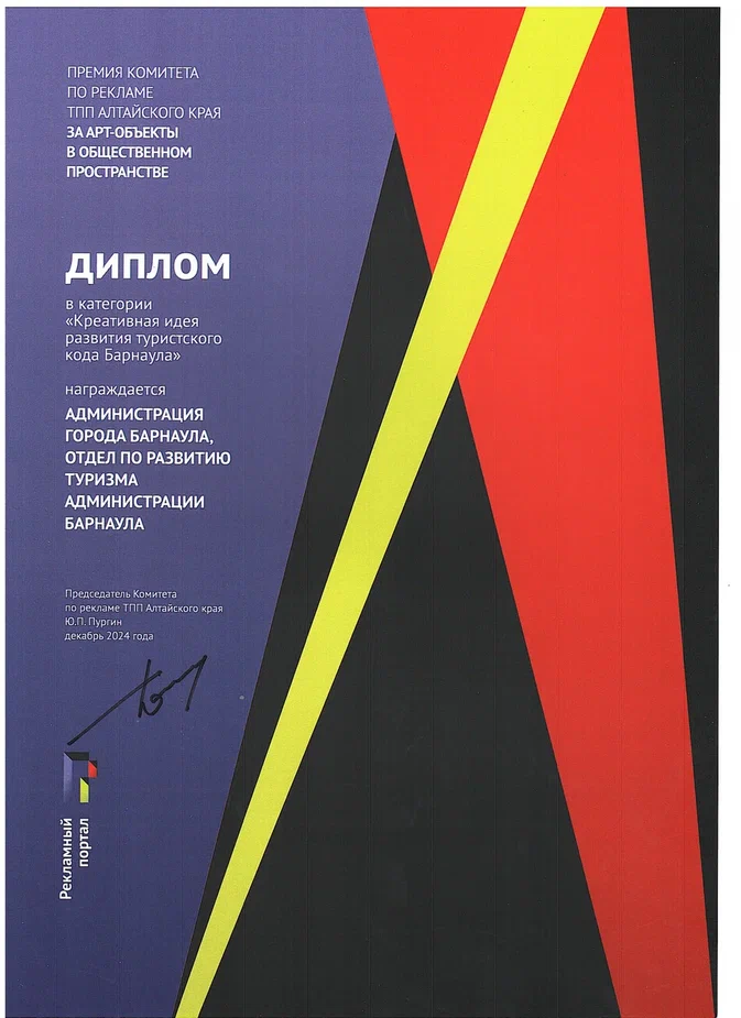Проект туристического маршрута с арт-объектами «Городские истории» отдела по развитию туризма администрации города Барнаула был номинирован на премию Комитета по рекламе Торгово-промышленной палаты Алтайского края.