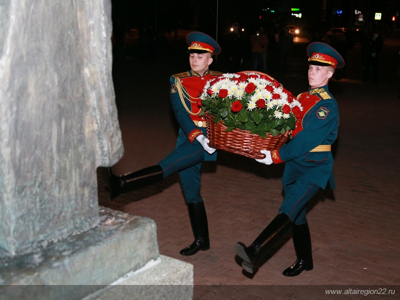 Собравшиеся зажгли «Свечи памяти» и возложили цветы на центральном монументе - к скульптурной группе «Прощание», к монументу с именами барнаульцев - полных кавалеров ордена Славы и Героев Советского Союза, а также к размещенным на стенах символического бетонного редута (разомкнутого с двух сторон кольца) именам погибших воинов Алтайского края,