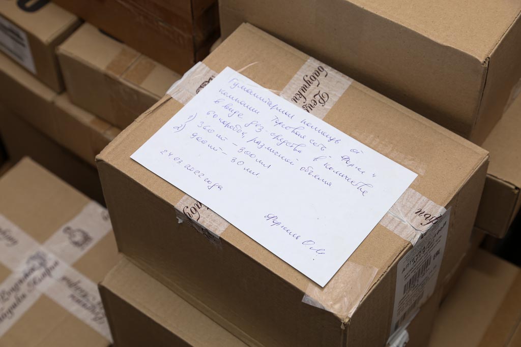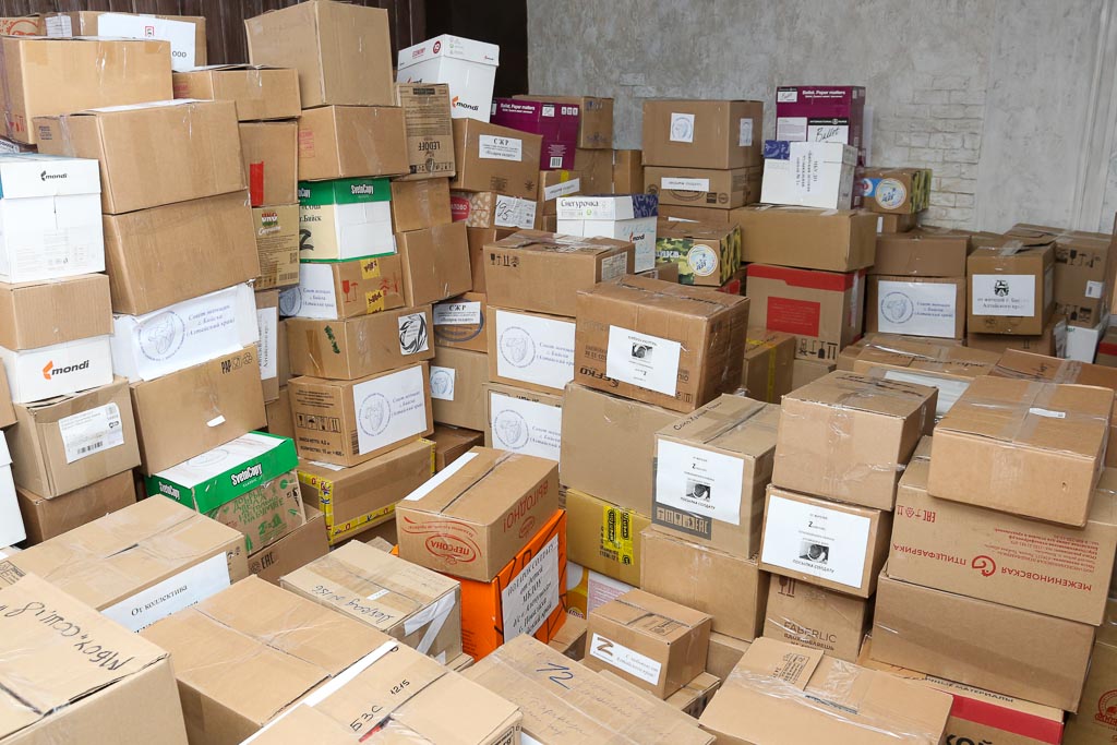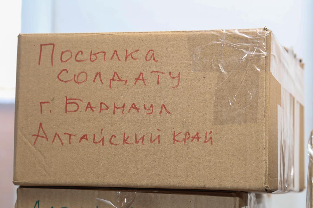 В посылки упаковывали сладости, одежду, чай, антисептики, средства гигиены. На каждой коробке красуется наклейка – она сообщает, откуда и от кого пришел подарок: «Коллектив Алтайского государственного театра кукол «Сказка», «От жителей города Бийска», «Совет женщин г. Барнаул», «От жителей Zудилово Первомайского района Алтайского края» и т.д.