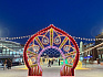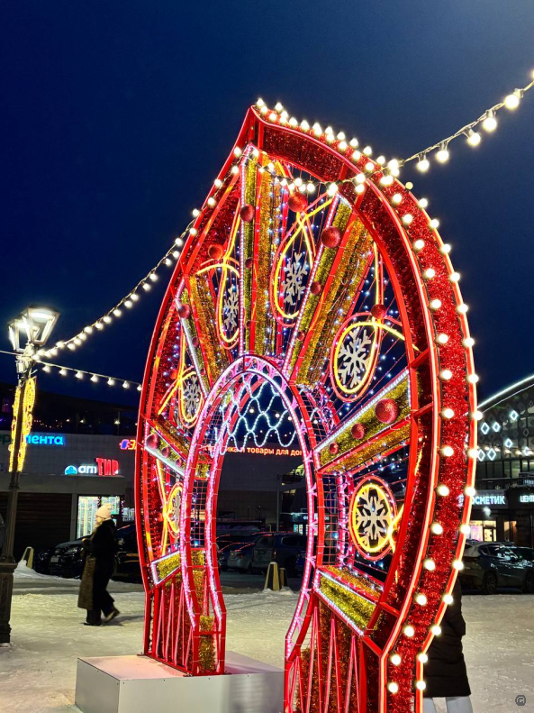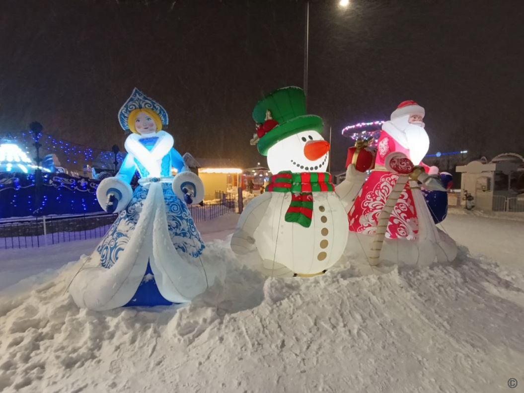 У входа на новогоднюю площадку со стороны проспекта Ленина установлена световую конструкцию «Русский кокошник», сделаны фотозоны с изображением героев русских сказок, а также детские горки.