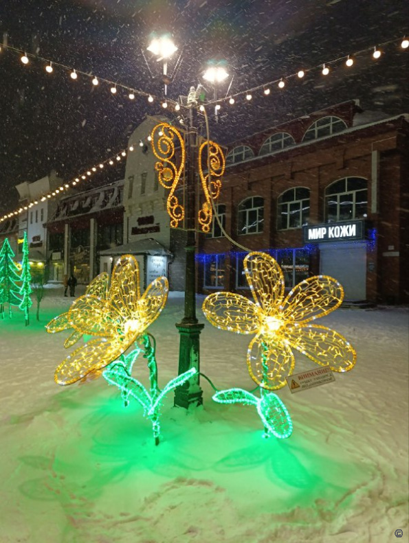 На улице установили шестиметровую искусственную ель, прогулочную зону украсили гирляндами, светящимися елями, шарами, цветами, световыми фигурами «Лебеди», «Бабочка» и «Звезда».