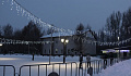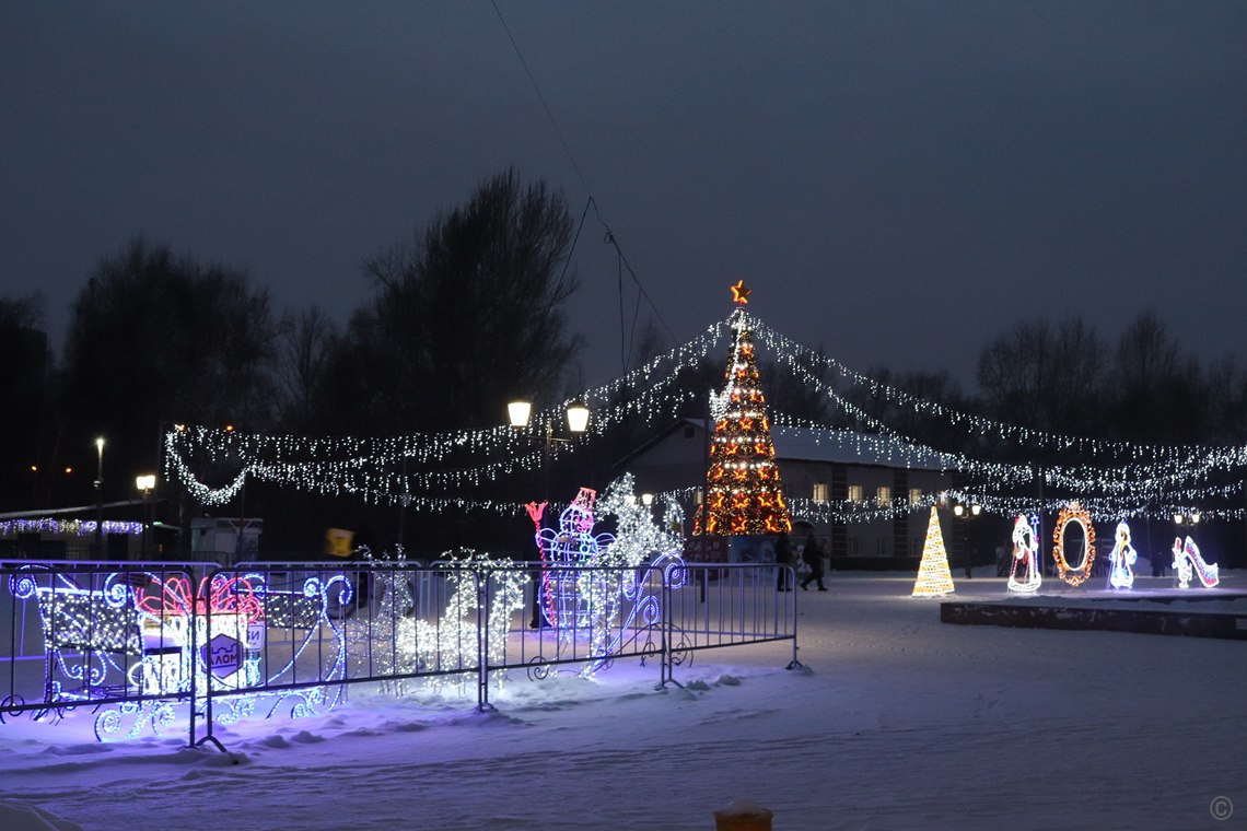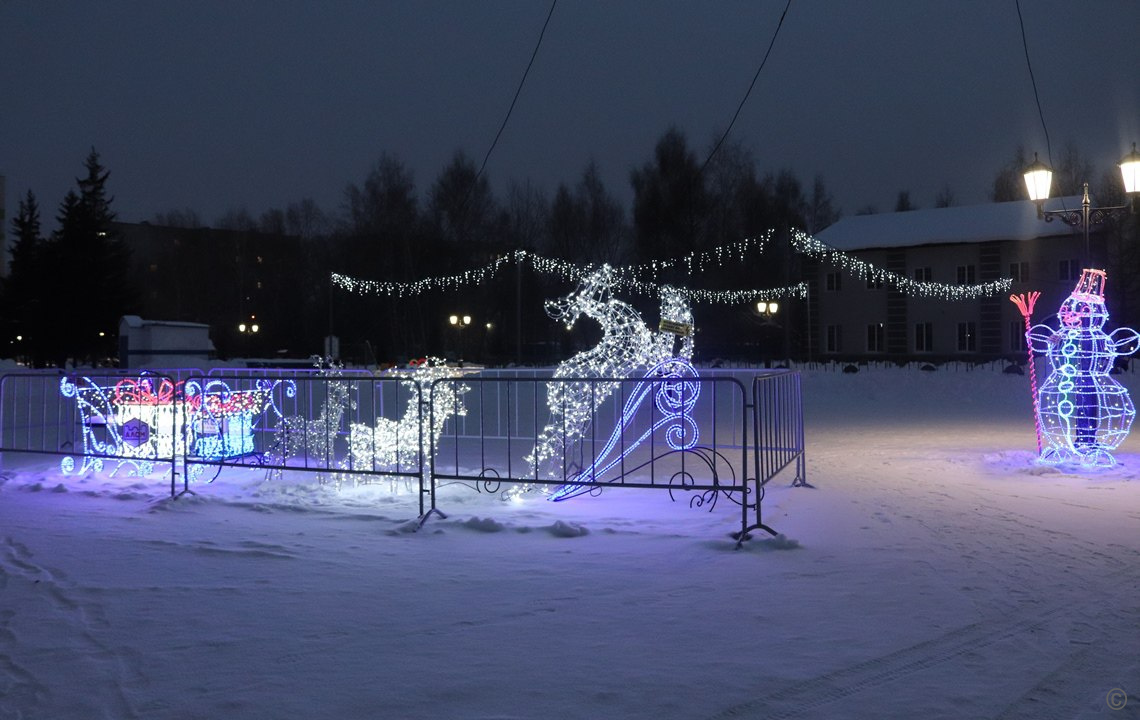 Накануне здесь установили две деревянные горки, которые будут залиты в ближайшие дни. В вечернее время на площади работает праздничная иллюминация, ребятишки уверенно встают на коньки на освещенном катке.