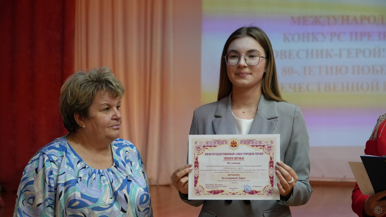 На площадке Барнаульского городского детско-юношеского центра состоялась торжественная церемония награждения победителей Международного детского конкурса презентаций «Мой ровесник – Герой!», посвященного 80-летию Победы в Великой Отечественной войне 1941-1945 гг. Он был организован Президиумом Межгосударственного Союза Городов-Героев в мае-июле 2025 года.