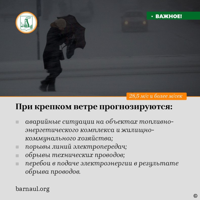 Напомним, по прогнозу синоптиков, 4 и 5 апреля в Алтайском крае ожидается усиление ветра до 18-23 м/с, местами с порывами до 25-30 м/с. В Барнауле 4 апреля переменная облачность, также преимущественно без осадков. Ветер южный ночью 5-10 м/с, днём 10-15 м/с.