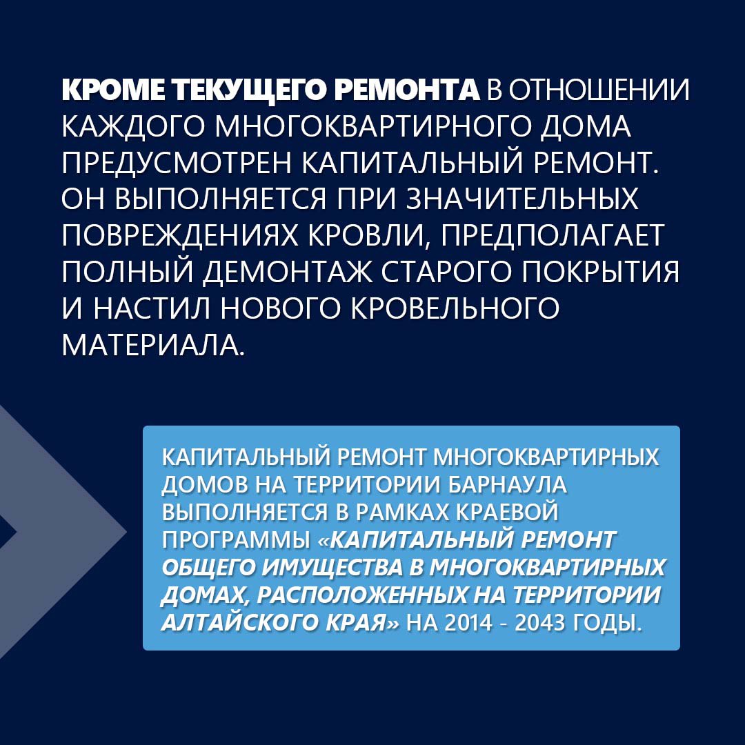 Кроме текущего ремонта в отношении каждого многоквартирного дома предусмотрен капитальный ремонт. Он выполняется при значительных повреждениях кровли, предполагает полный демонтаж старого покрытия и настил нового кровельного материала.
