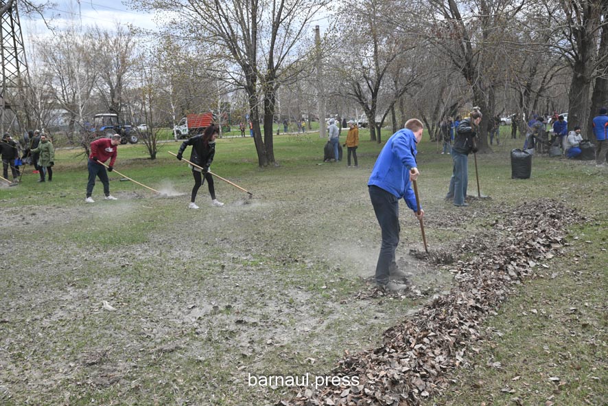 На территории Октябрьского района студенты Алтайского государственного колледжа, Алтайского промышленно-экономического колледжа и Барнаульского государственного педагогического колледжа, Алтайского архитектурно-строительного колледжа убирали прошлогоднюю листву и мусор около своих образовательных учреждений.