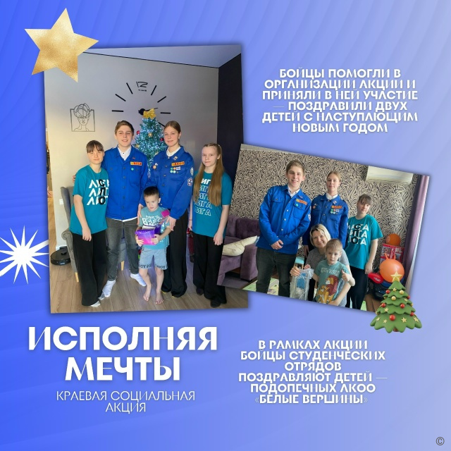 Бойцы студенческого отряда «Алтай» провели благотворительную Краевую социальную акцию «Исполняй мечты» для детей с особенностями в развитии, подопечных АКОО «Белые вершины». В этом году ребята из 30 студенческих отрядов исполнили мечты 24 ребят.