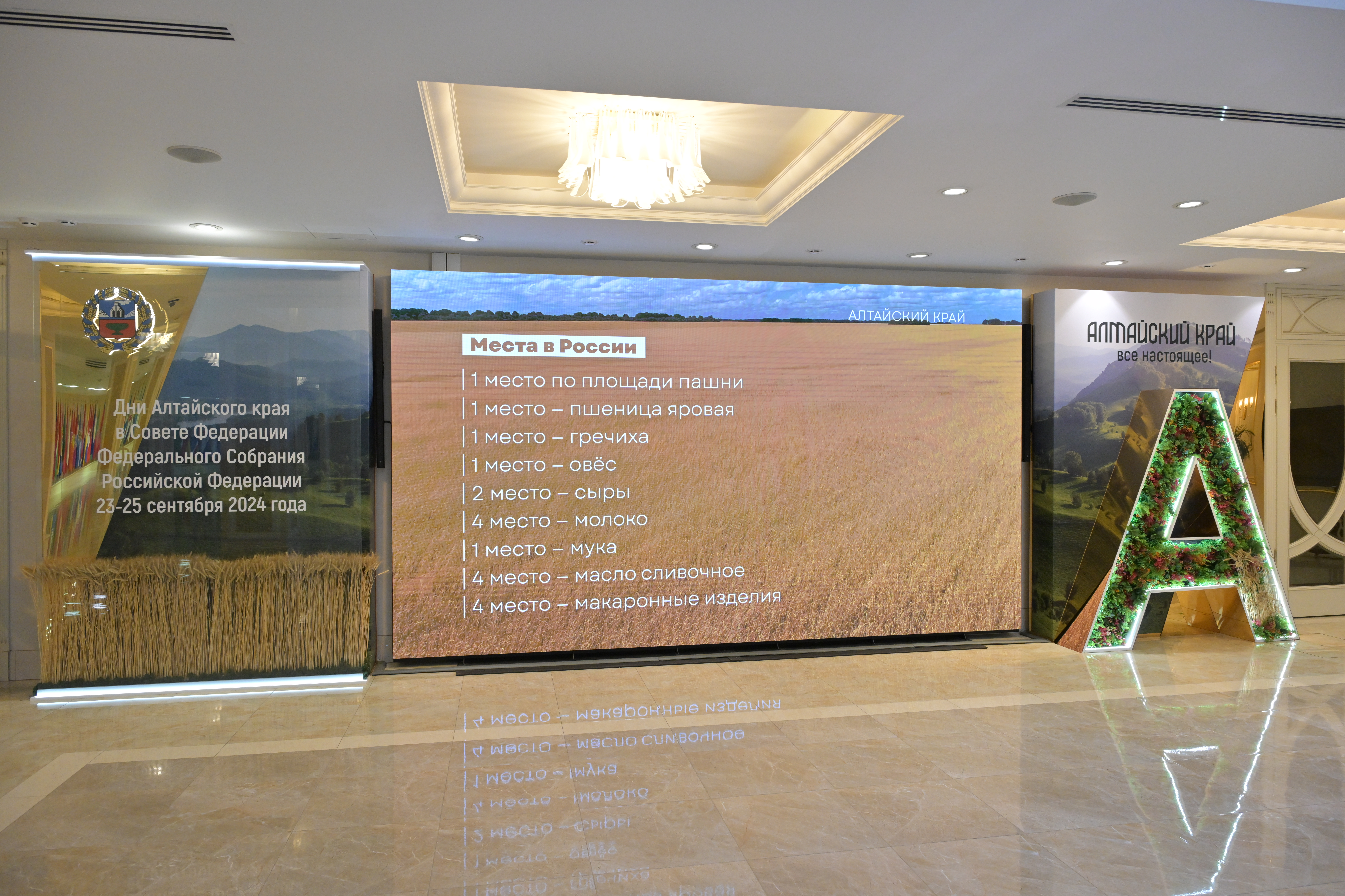 Также сегодня в Совете Федерации начала работу экспозиция Алтайского края. На ней представлены основные направления развития края от сельского хозяйства, промышленности, до социальной сферы и туризма.