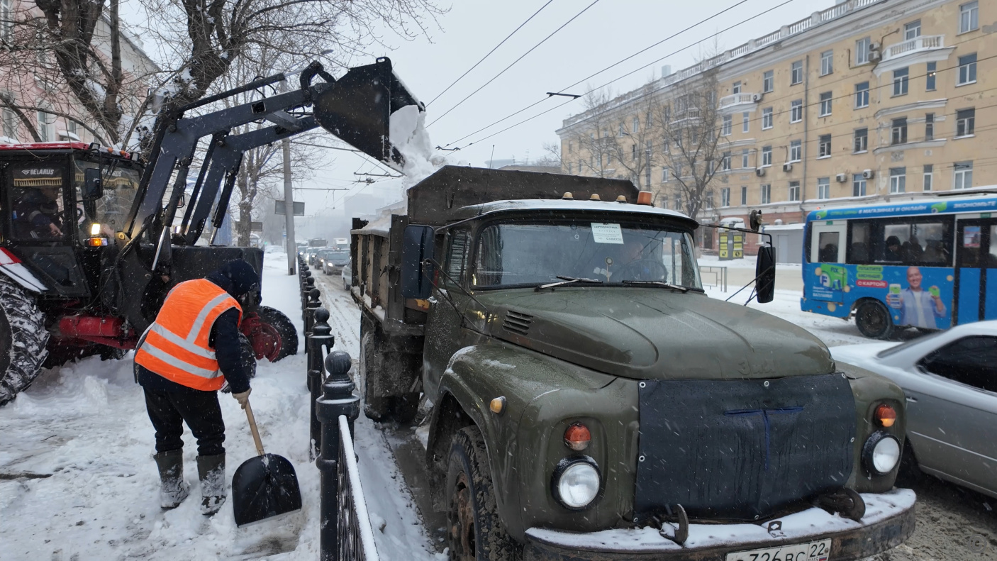 В дневную смену вывоз снега после очистки остановок и подходов к пешеходным переходам проводится с улиц и проспектов: Змеиногорском тракте, Красноармейском проспекте, Малахова, Георгия Исакова, Сергея Семенова, Солнечная Поляна, Павловский тракт, Попова и с других участков.