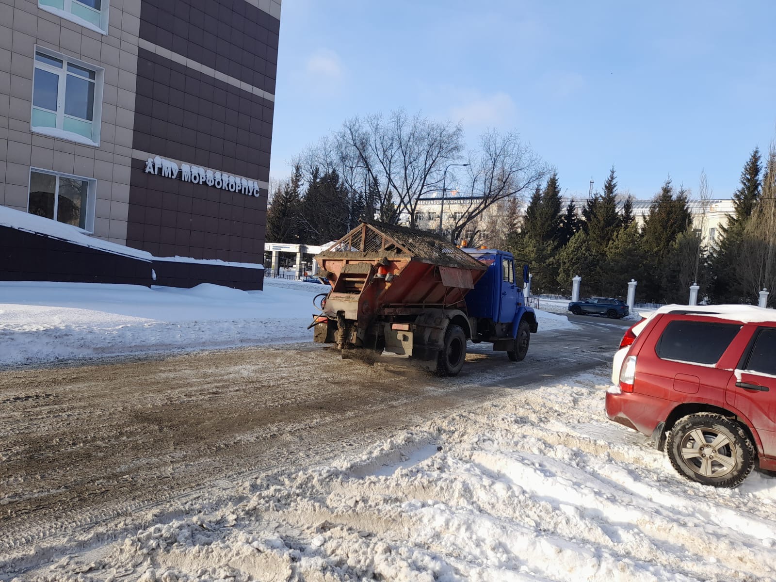 Организована обработка противогололедными реагентами дорожных участков по улицам: Крупской, Мерзликина, Папанинцев, Деповская, Брестская, Союза Республик, Малахова, Островские, Юрина, Петра Сухова, Смирнова, Эмилии Алексеевой, Германа Титова, Малахова, Глушкова, Чудненко и др.