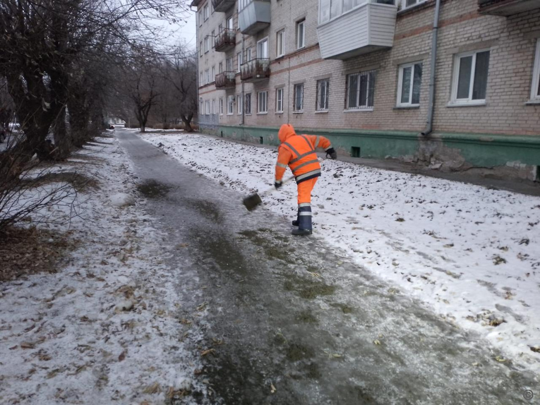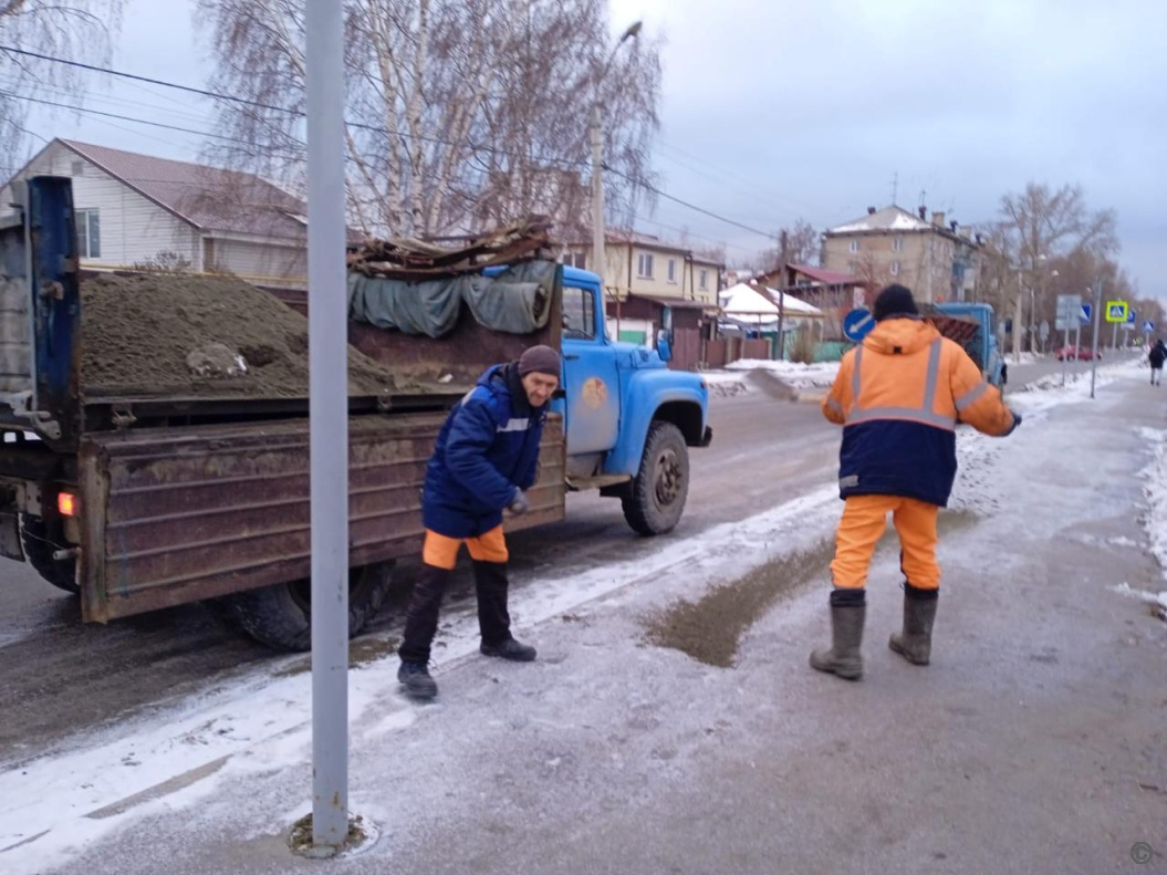 Работы по посыпке проводятся на пешеходных переходах и площадках остановочных павильонов во всех районах города.