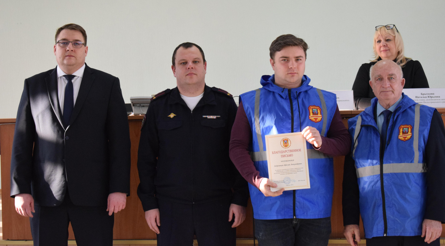 Справка: Численность отряда Индустриального района составляет 119 добровольцев. Результатом работы народной дружины в 2024 году стали: участие в 980 мероприятиях по охране общественного порядка, раскрытие 18 преступлений, пресечение и выявление 628 административных правонарушений, проверка 326 лиц, состоящих на профилактических учетах ОВД.