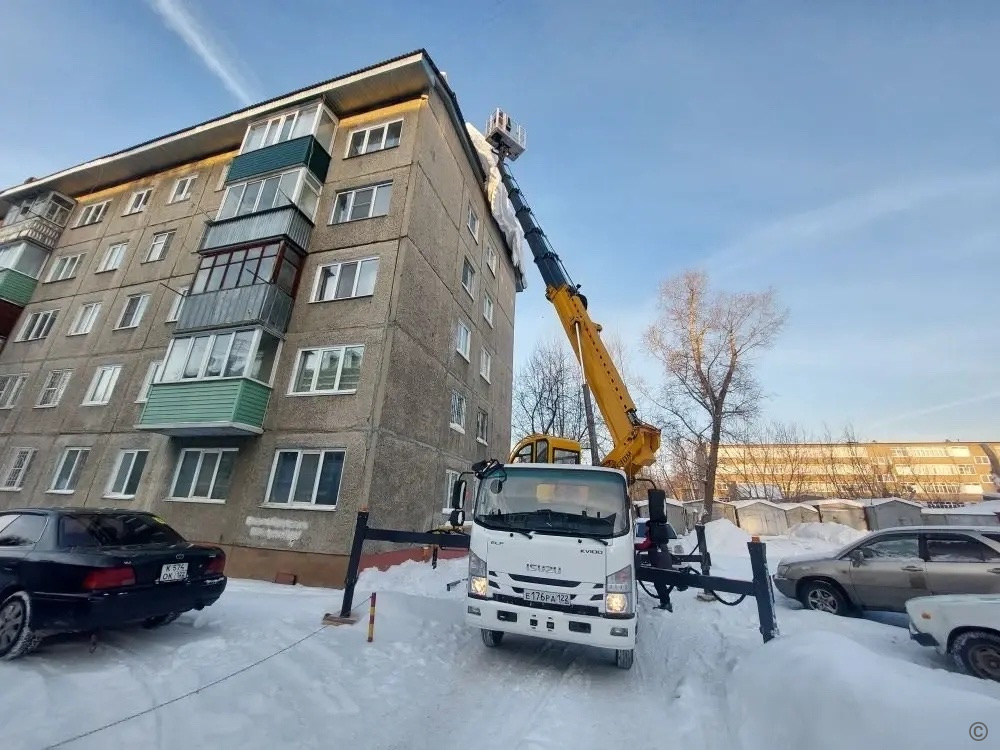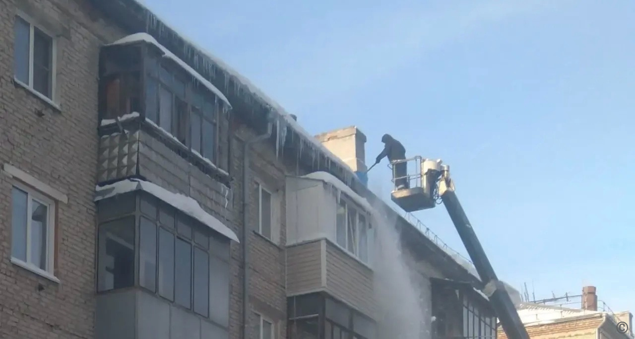 Дворы и кровли домов, расположенные в Октябрьском районе Барнаула, продолжают очищать от снега и наледи