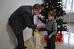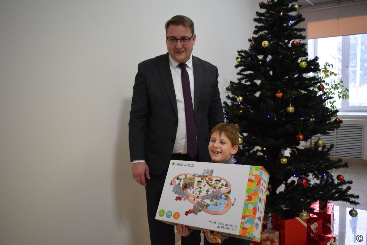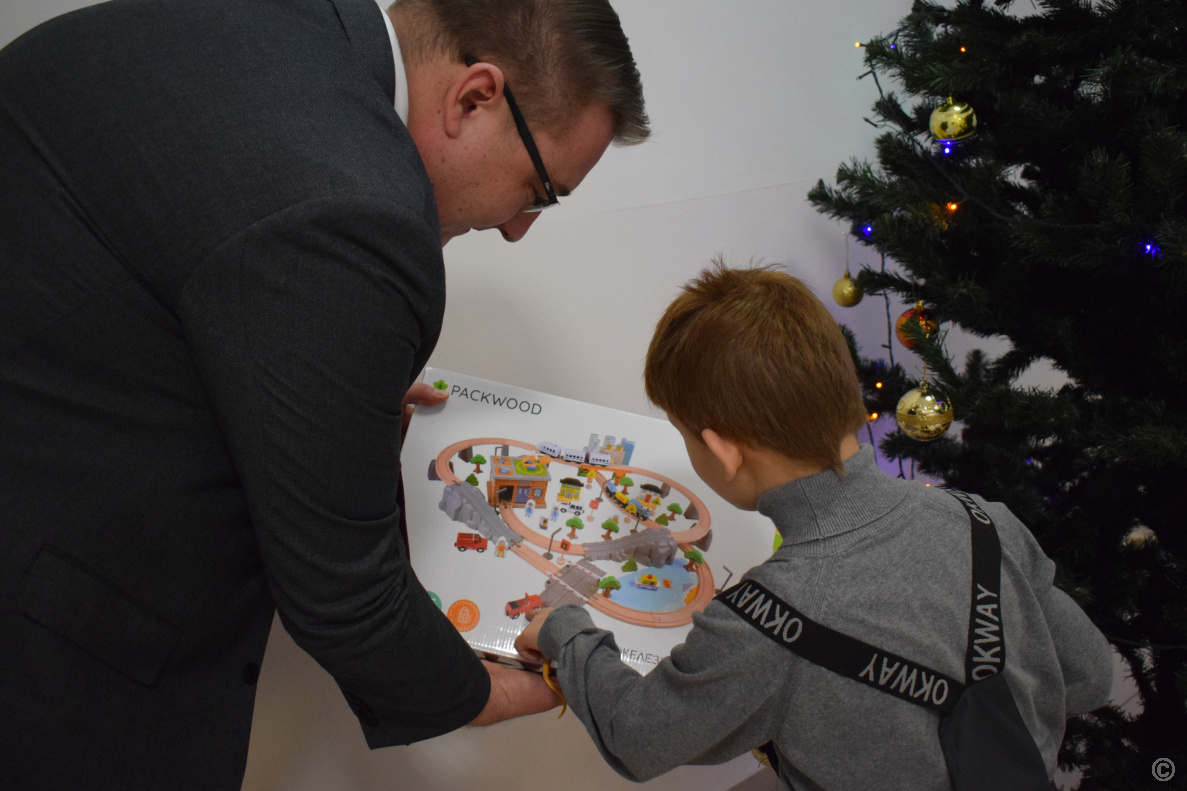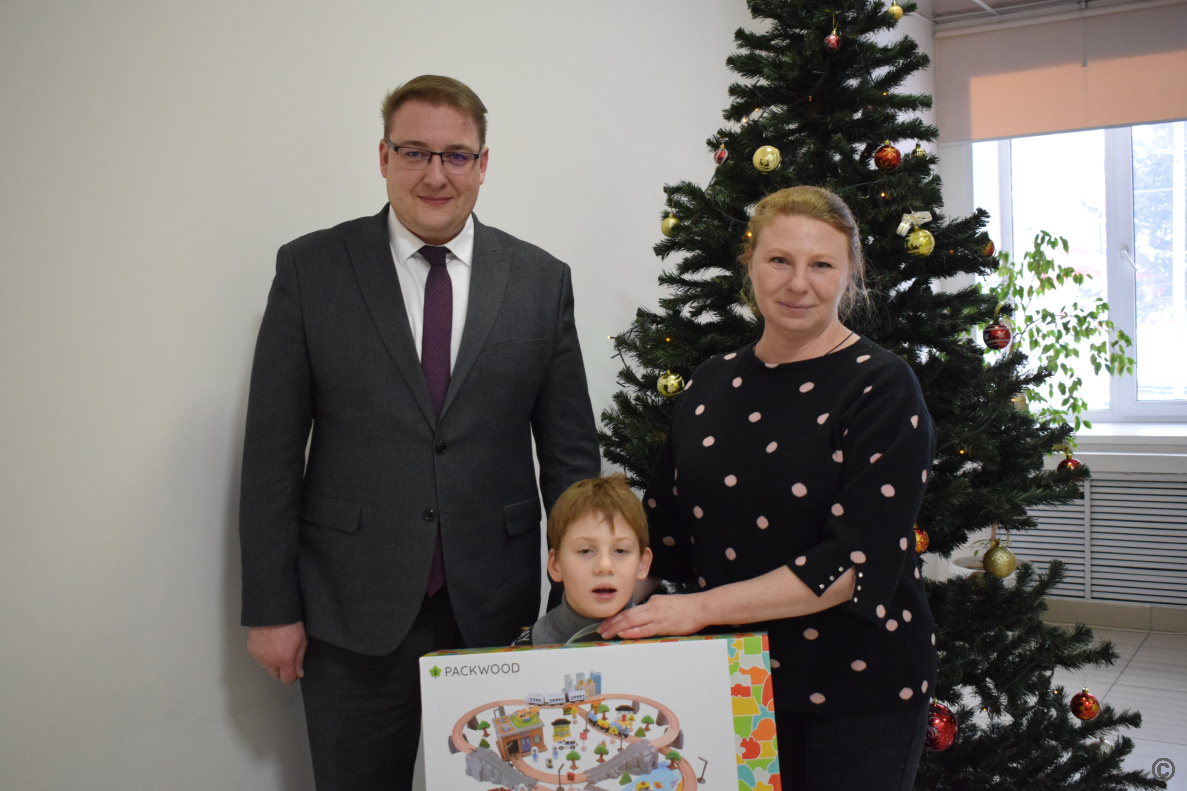 Глава в торжественной и одновременно теплой обстановке пообщался с семьей, поздравил с наступающим Новым годом и вручил Сереже подарок – деревянную железную дорогу.
