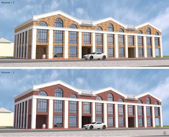 Добавили архитектурные элементы в виде поясков, колонн, пилястр, фронтонов, проработали ограждение кровли, узлы водоотведения, сделали более мелким членение витражей на лицевом фасаде. Вход в здание – заглублен, без выступающего крыльца