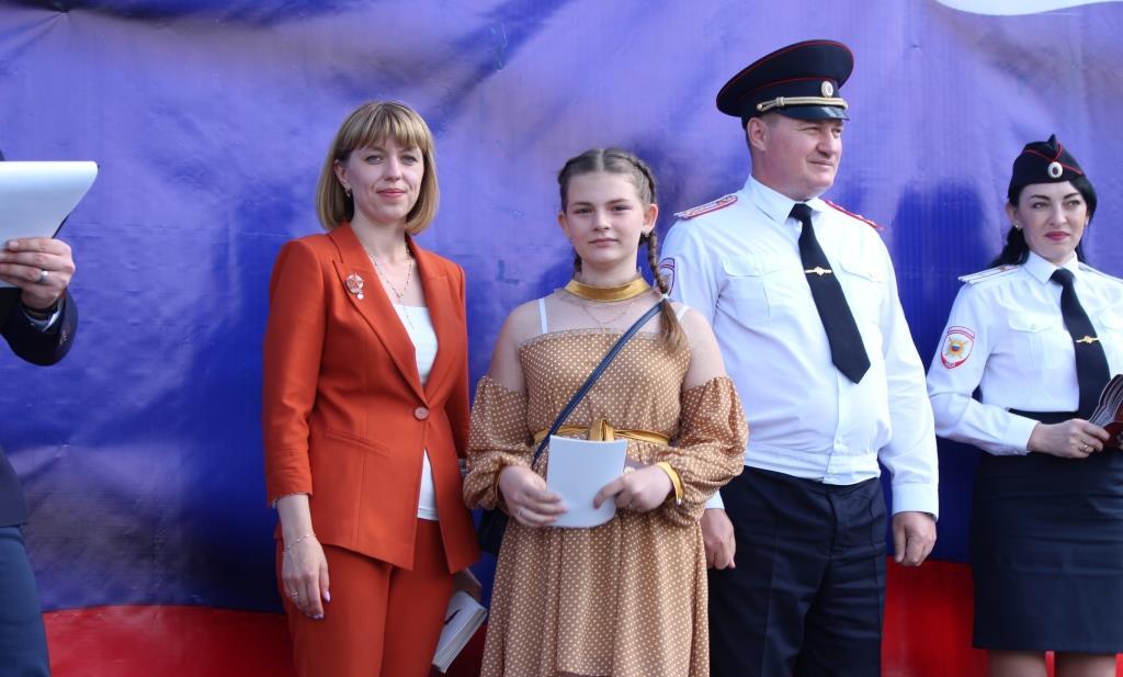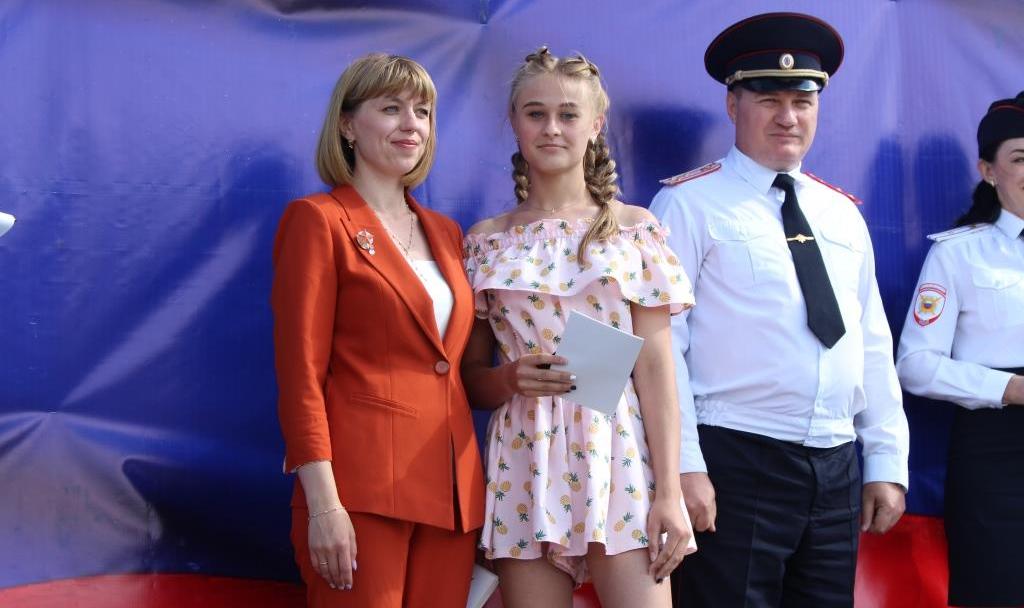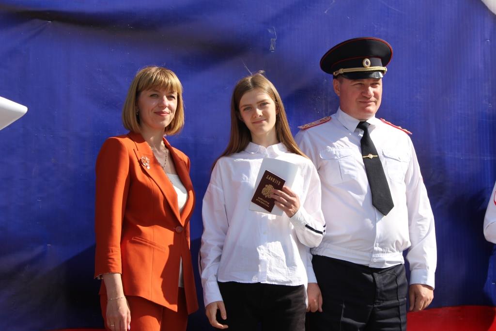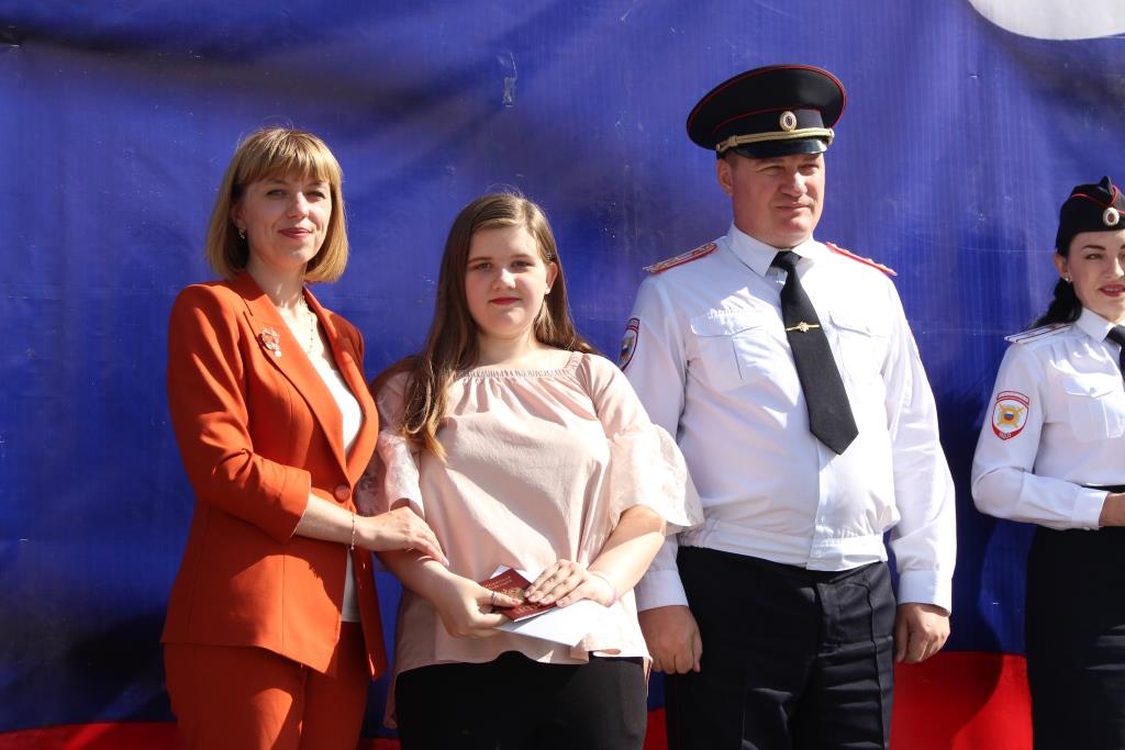 В поселке Южный в рамках празднования Дня России прошло торжественное вручение паспортов юным россиянам. Шестнадцати школьникам вручили основной документ, удостоверяющий личность гражданина из рук начальника отдела полиции № 4 УМВД России по г. Барнаулу Евгения Дегтярева. Поздравила присутствующих с государственным праздником заместитель главы администрации Центрального района Ольга Новикова: