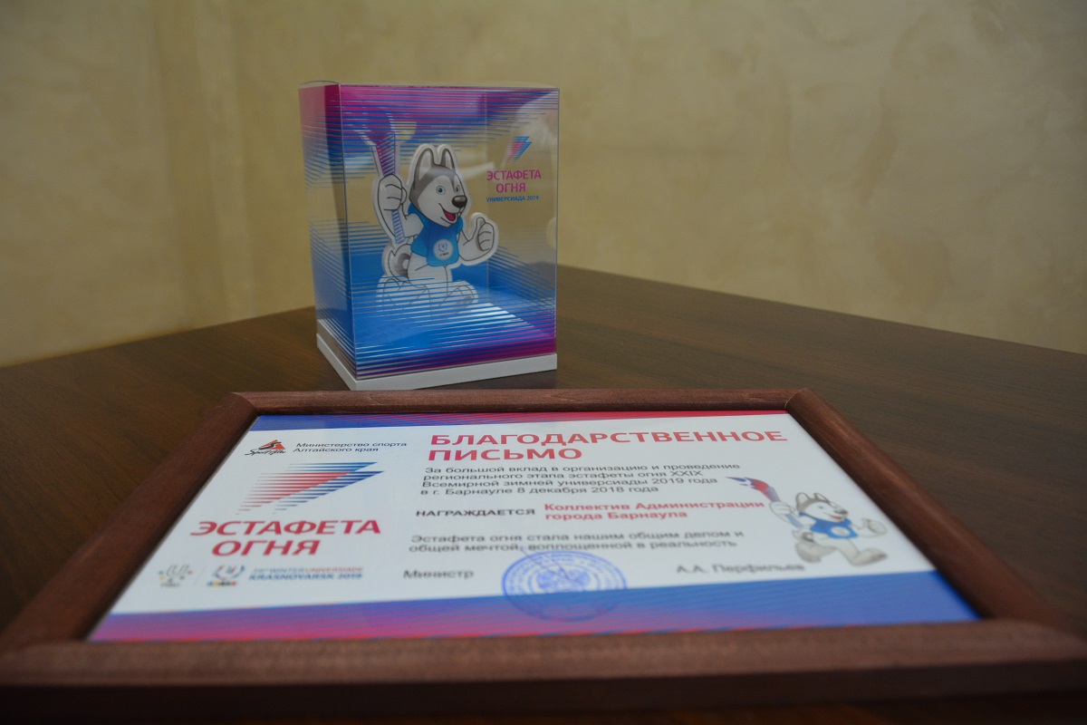 Благодарственное письмо коллективу администрации Барнаула за большой вклад в организацию и проведение регионального этапа эстафеты огня XXIX Всемирной зимней универсиады-2019 вручили сегодня, 26 декабря, в Министерстве спорта Алтайского края.