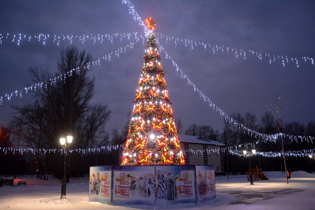 Сейчас там уже возведена и оформлена 12-метровая искусственная ель. Ограждение ели оформили поздравительными баннерами, зажглись световой потолок, светодиодные фигуры. Ледовые фигуры Деда Мороза и Снегурочки, расположенные в центре площади у елки, уже готовы встречать гостей городка. Также на площади Мира обустраивают две каркасные деревянные горки для детей.