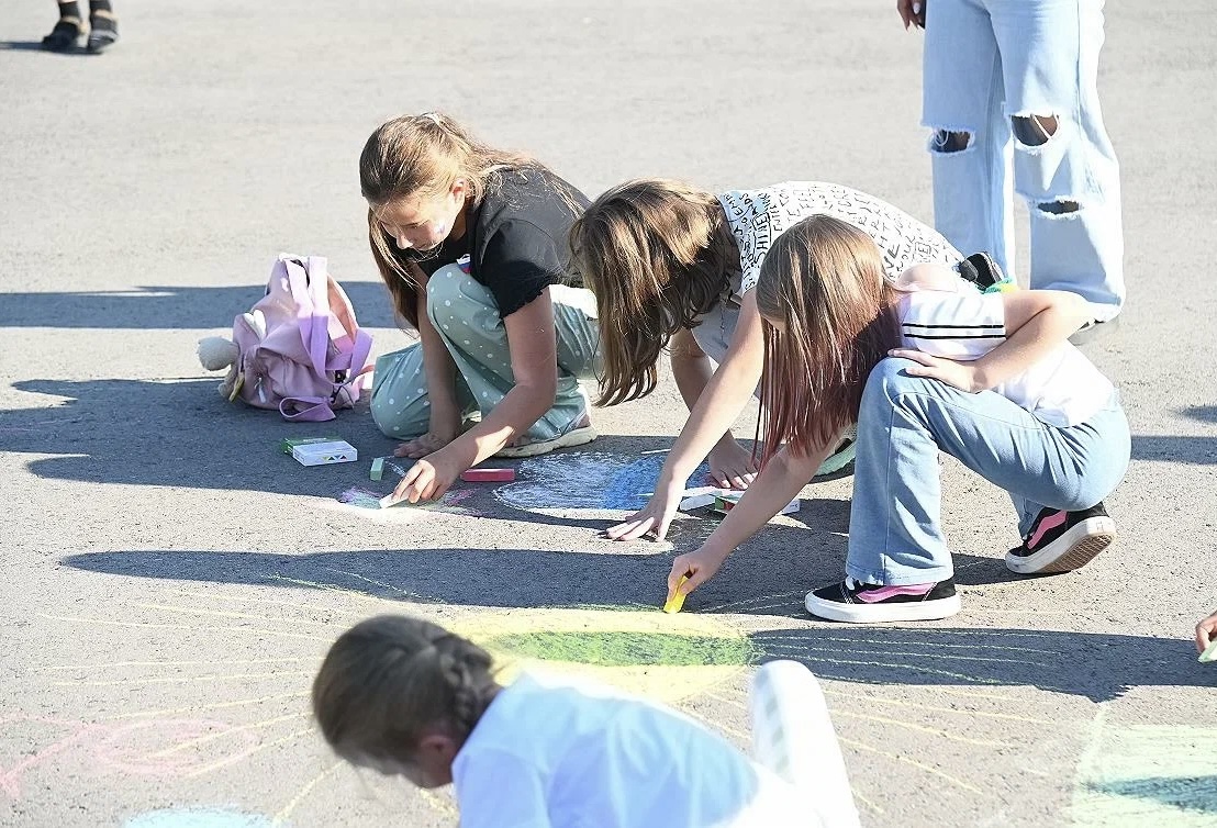 В течение всего праздника в парке работали тематические анимационные площадки. Можно было раскрасить большую раскраску, сделать аквагрим, смастерить виньетку из лент триколор и порисовать мелками на асфальте.