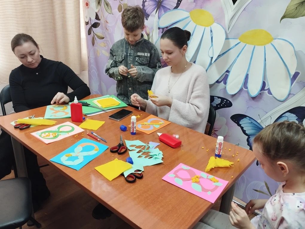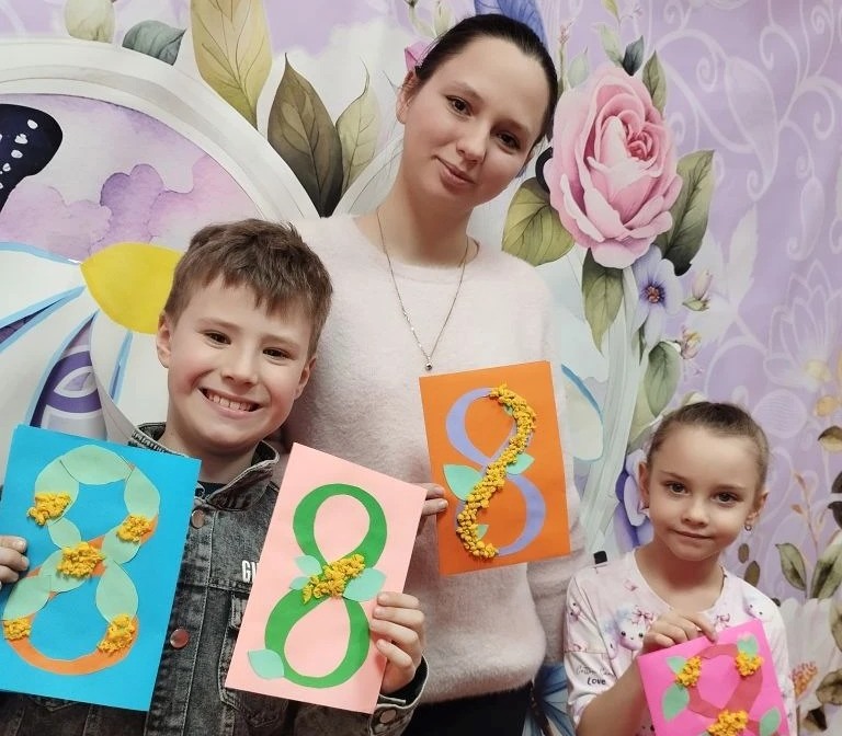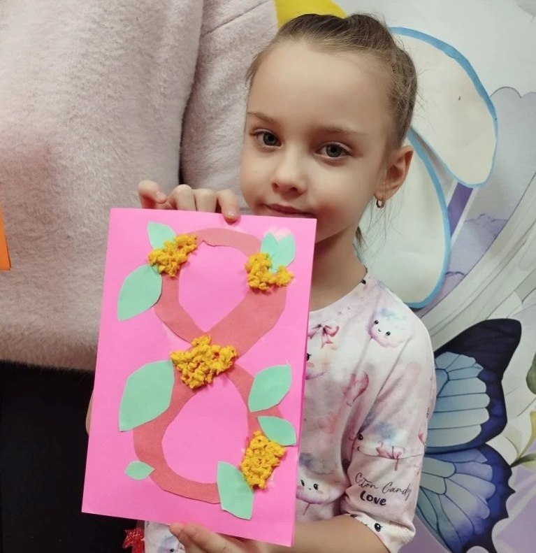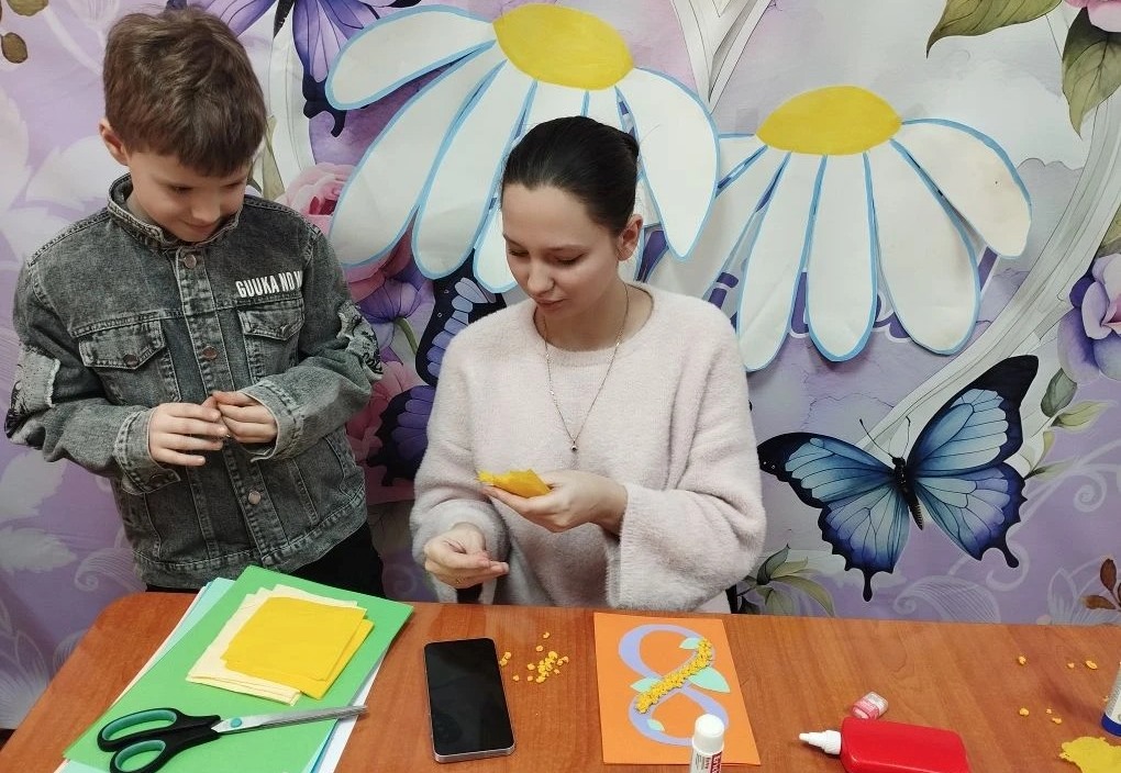На мастер-классе дети узнали о значении и истории праздника и научились делать поздравительные открытки своими руками. Они были оформлены в виде веток мимозы.