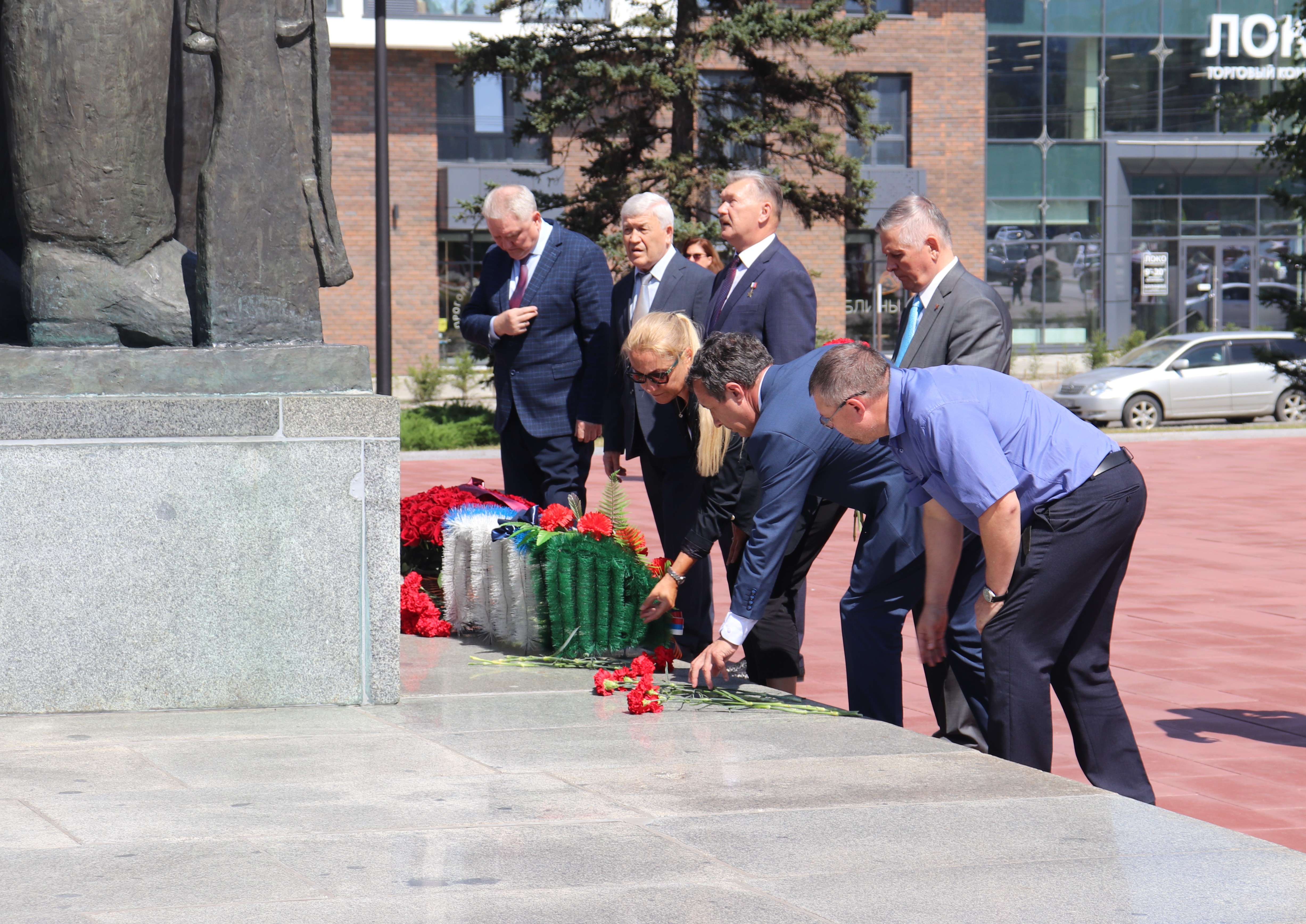 1 августа руководство региона, глава администрации Железнодорожного района совместно с делегацией из Москвы возложили цветы к скульптурной группе «Прощание».