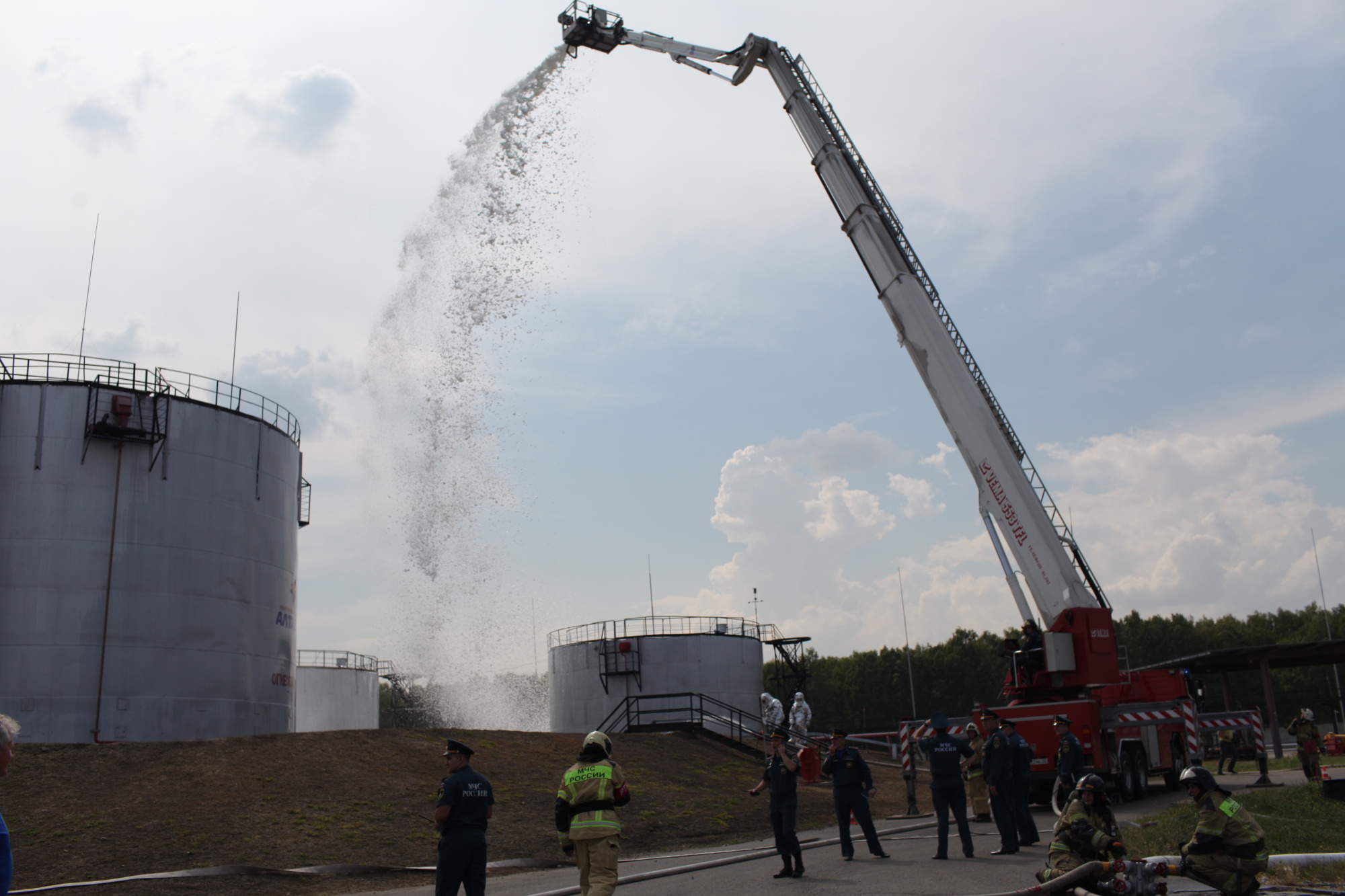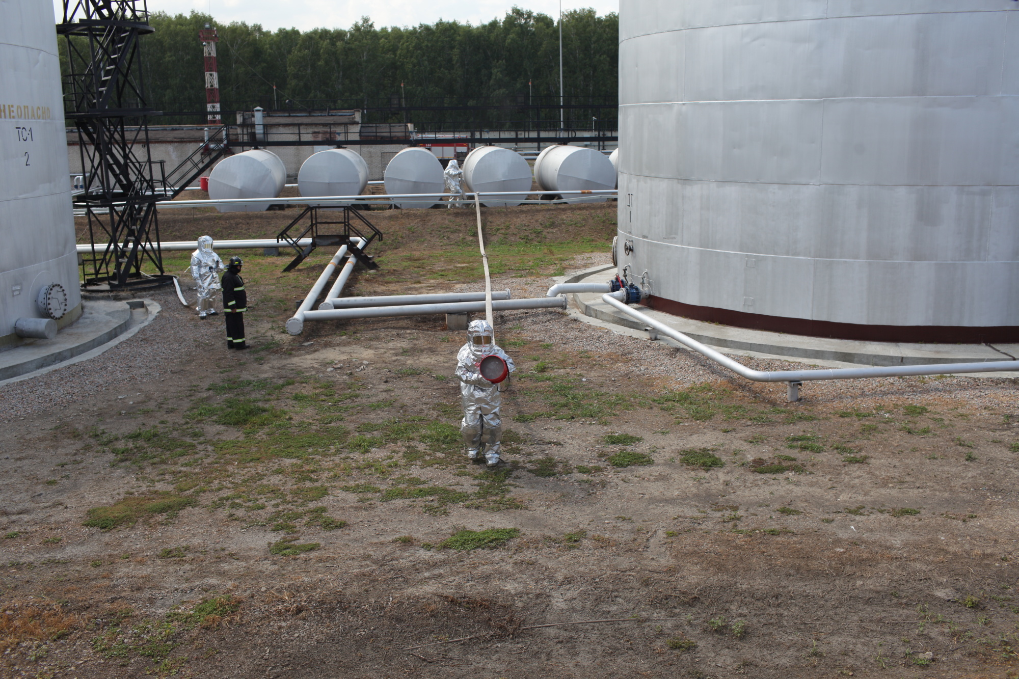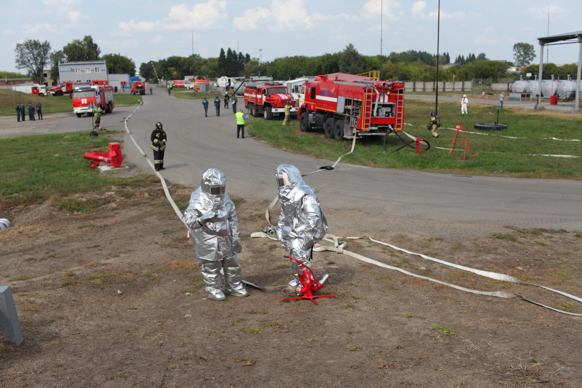 Учебное мероприятие провели на складе авиапредприятия «Алтай». Склад занимает площадь свыше 10 гектаров. Здесь в стальных резервуарах хранятся бензин, керосин, дизельное топливо, масла.