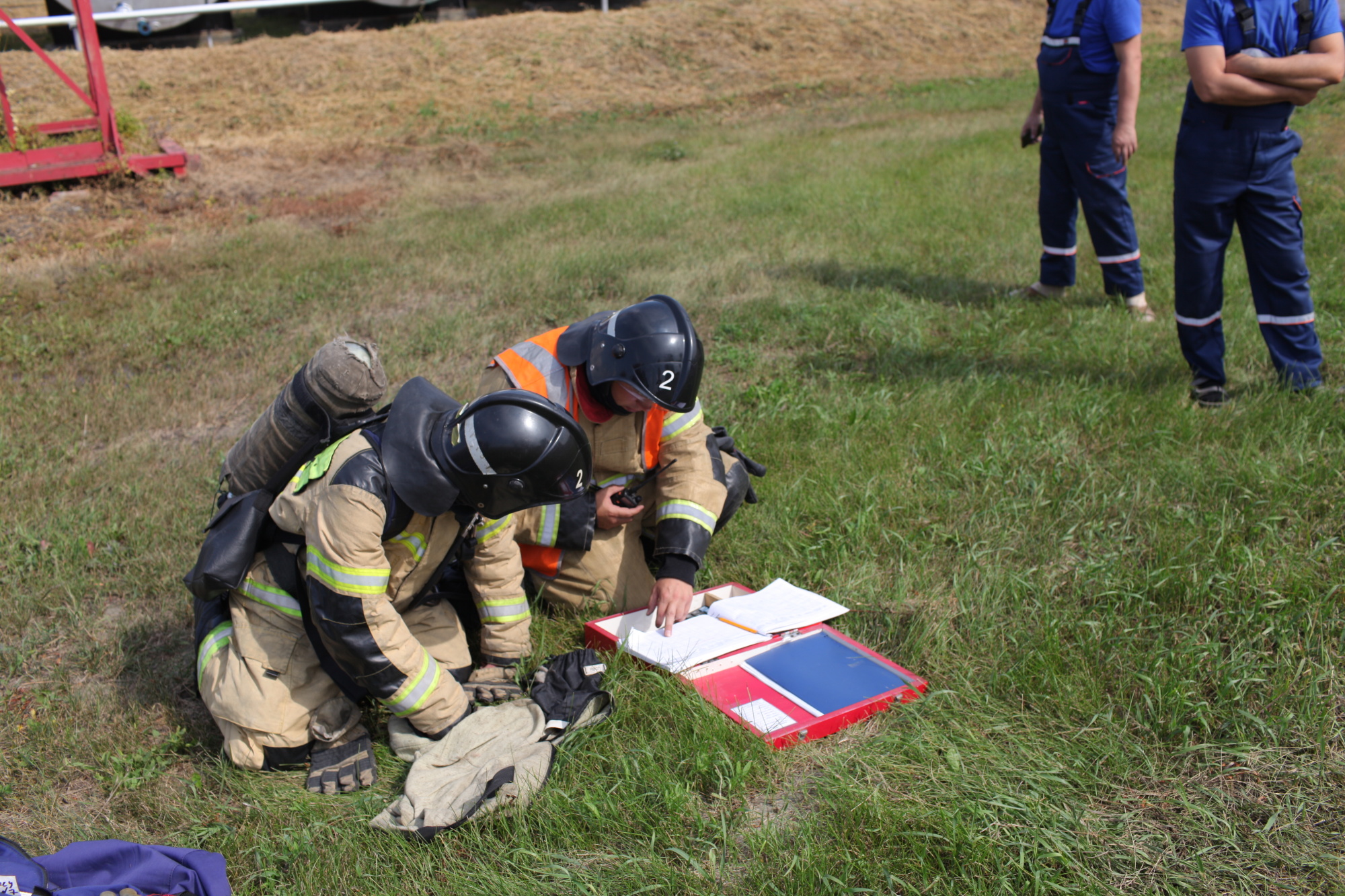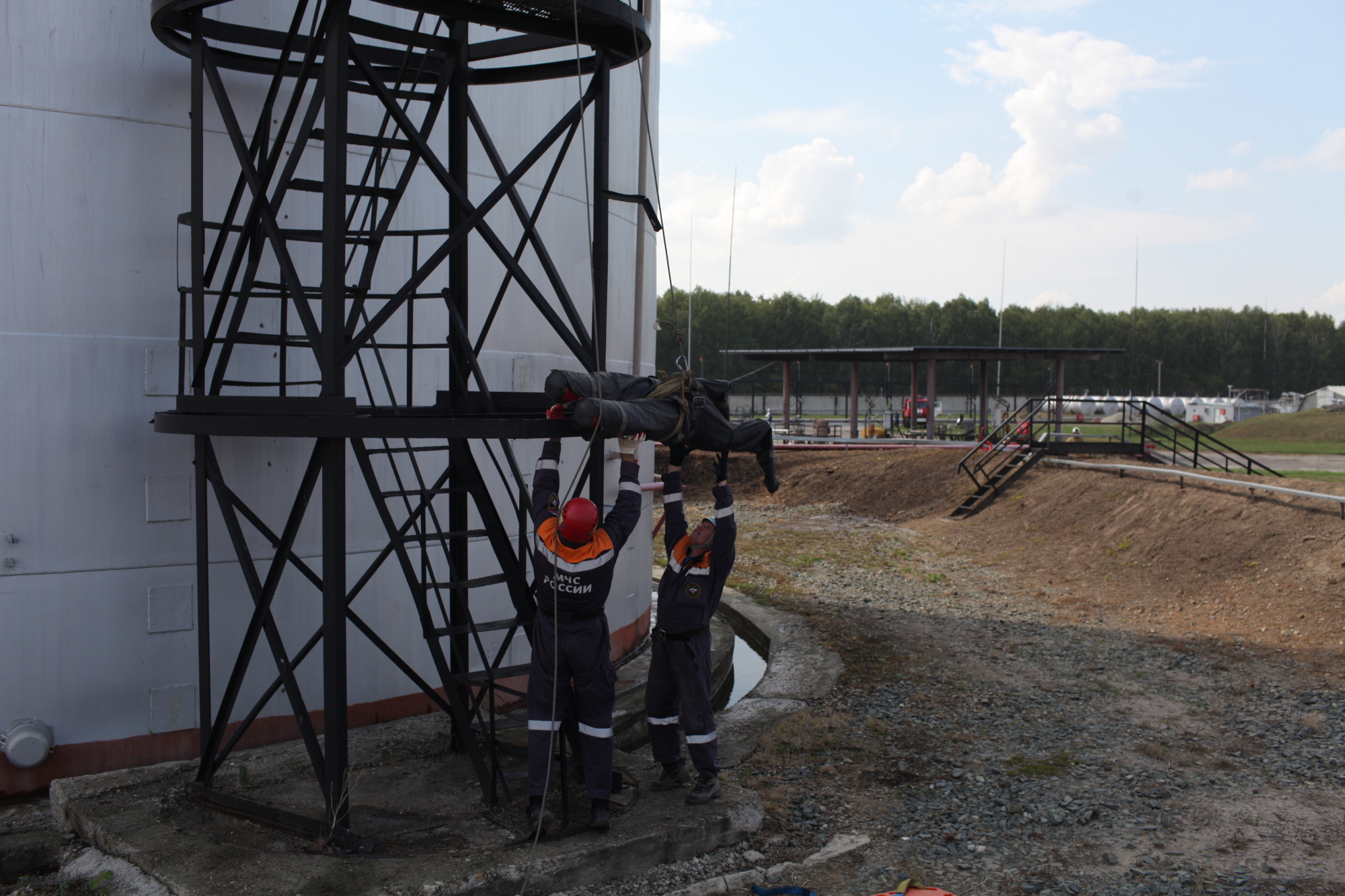 Прибывшие пожарные немедленно приступили к ликвидации возгорания, приготовились к пенной атаке. Внезапно поступило сообщение, что по лестнице соседнего резервуара самостоятельно не могут спуститься двое сотрудников нефтебазы, направленные для осмотра резервуара. Руководитель тушения сразу отправил спасателей эвакуировать пострадавших с помощью спинального щита и спасательной верёвки. Вскоре после пенной атаки «пожар» ликвидировали на площади около 300 квадратных метров, пострадавших спасли.