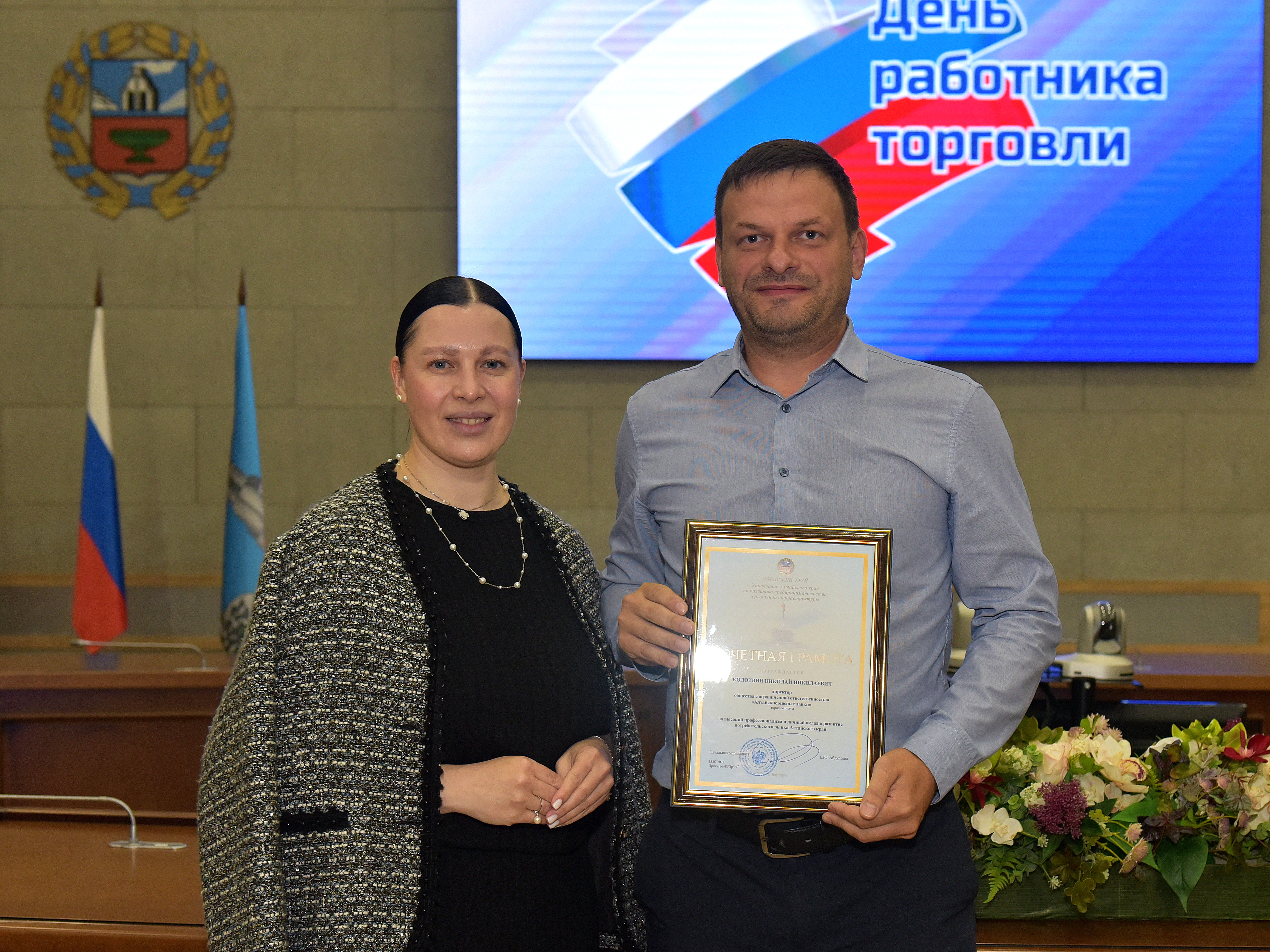 Среди награжденных - директор ООО «Алтайские мясные лавки» Николай Колотвин, который удостоен Почетной грамоты управления Алтайского края по развитию предпринимательства и рыночной инфраструктуры. Он отметил, что награда важна для всей компании и является результатом труда всего коллектива