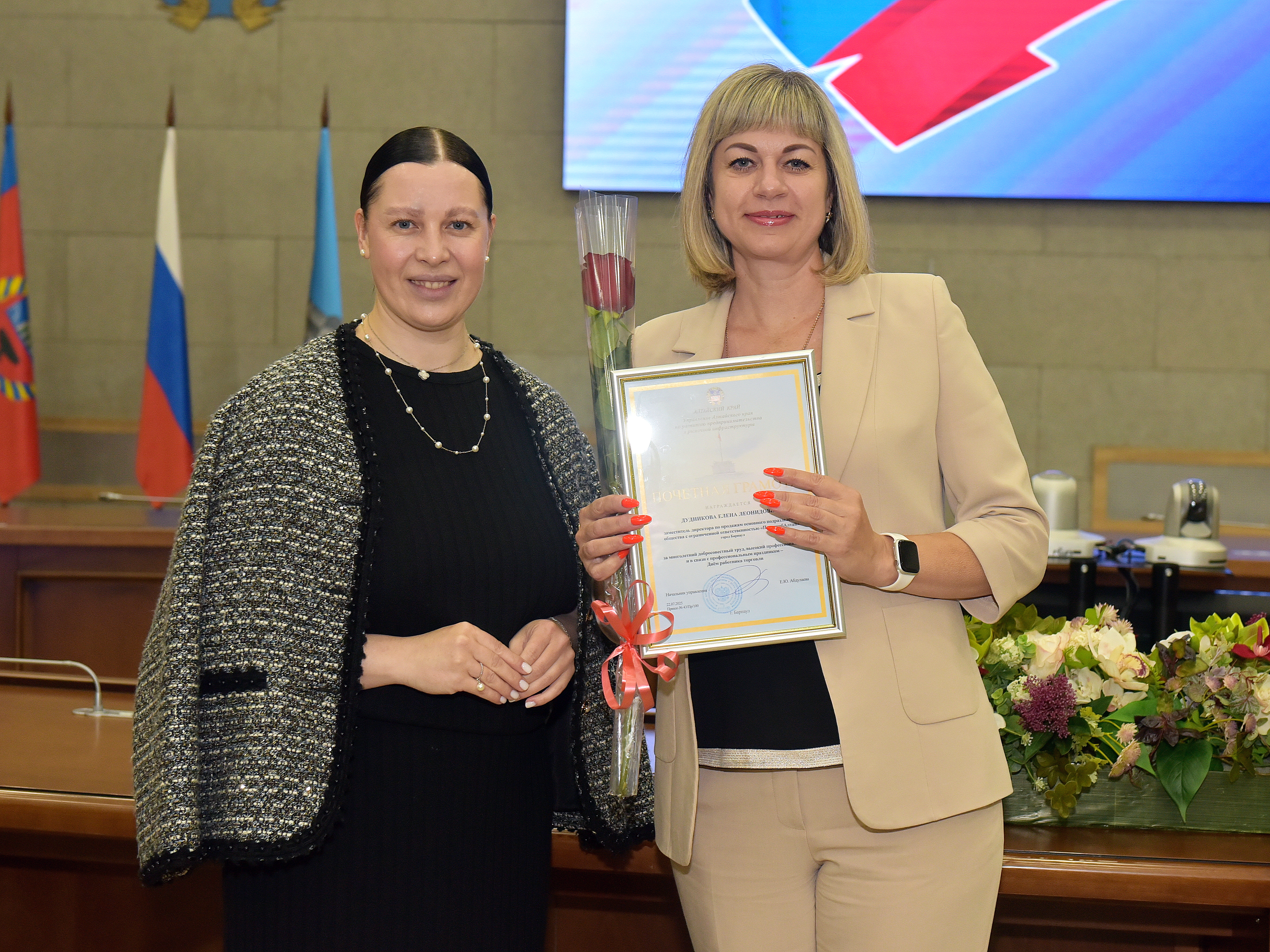 «По итогам 2024 года Алтайский край в Сибирском федеральном округе занял пятое место по оборотам и темпу роста оборота розничной торговли. Налоговые отчисления от этой отрасли в бюджет Алтайского края превышают 16%. Таких результатов невозможно добиться без вашего самоотверженного труда. Вы своими руками, своими улыбками каждый день делаете наших жителей счастливее. Сложно найти более динамично развивающуюся отрасль. Вы первыми ищите новые форматы, подходы к работе, стремитесь быть лучше. В самые нелегкие времена именно сфера торговли всегда на «передовой» и несмотря на все тяготы вы продолжаете улыбаться людям», - подчеркнула Елена Абдулаева.