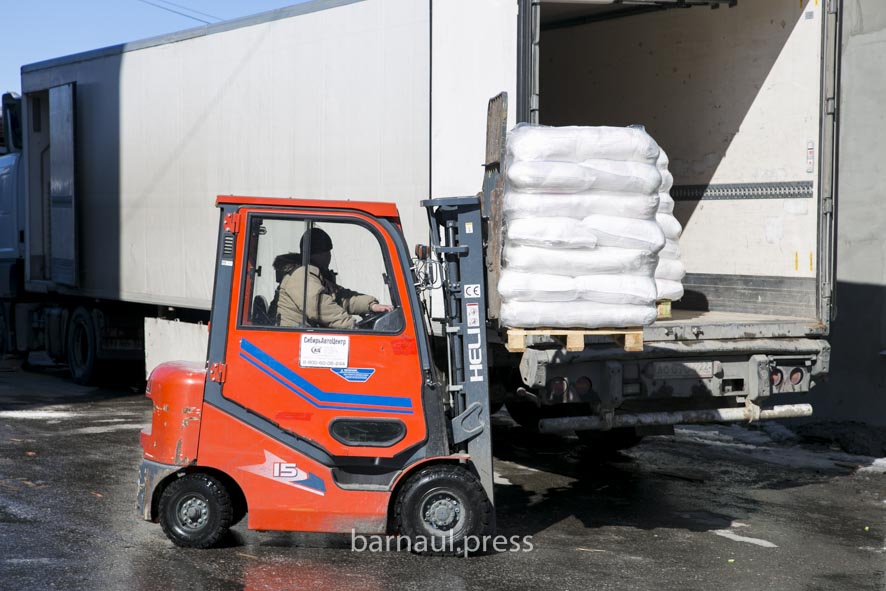 После доставки в Барнаул муку расфасовали в более удобную тару – мешки по пять килограммов. Эту работу провели силами предпринимателей при поддержке городского комитета по развитию предпринимательства, потребительскому рынку и вопросам труда.