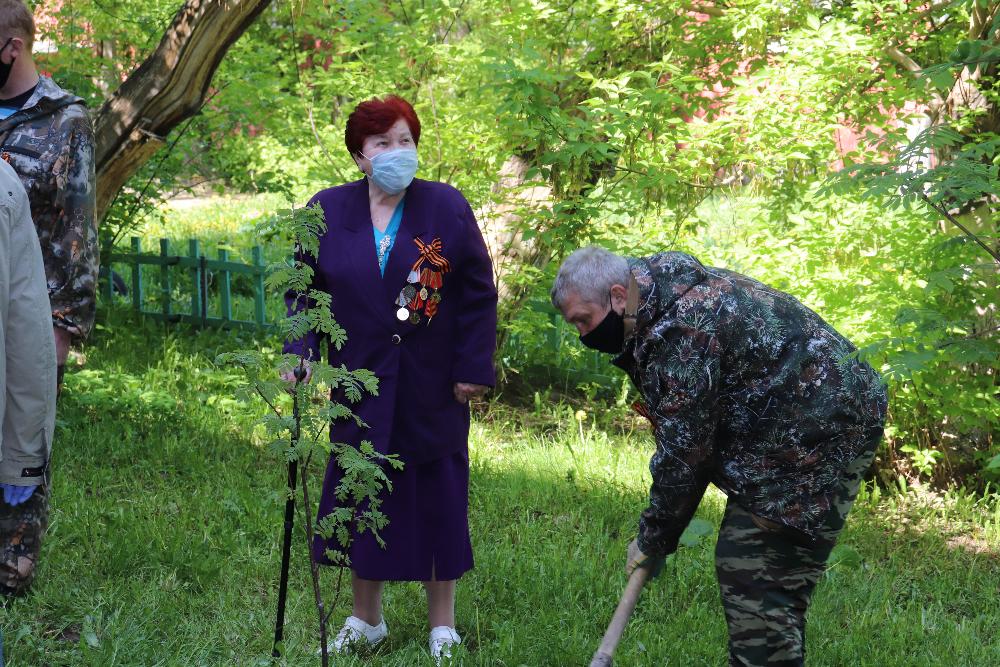На Социалистическом проспекте 120 в одном подъезде живут сразу три ветерана. Участник войны Григорий Кузьмич Зворыгин, его друг Иван Константинович Бездолев и труженица тыла Валентина Андреевна Косиненко. Теперь у каждого из них во дворе есть своё деревце. Григорий Кузьмич и депутат АКЗС Владимир Устинов рябиновый куст посадили вместе.
