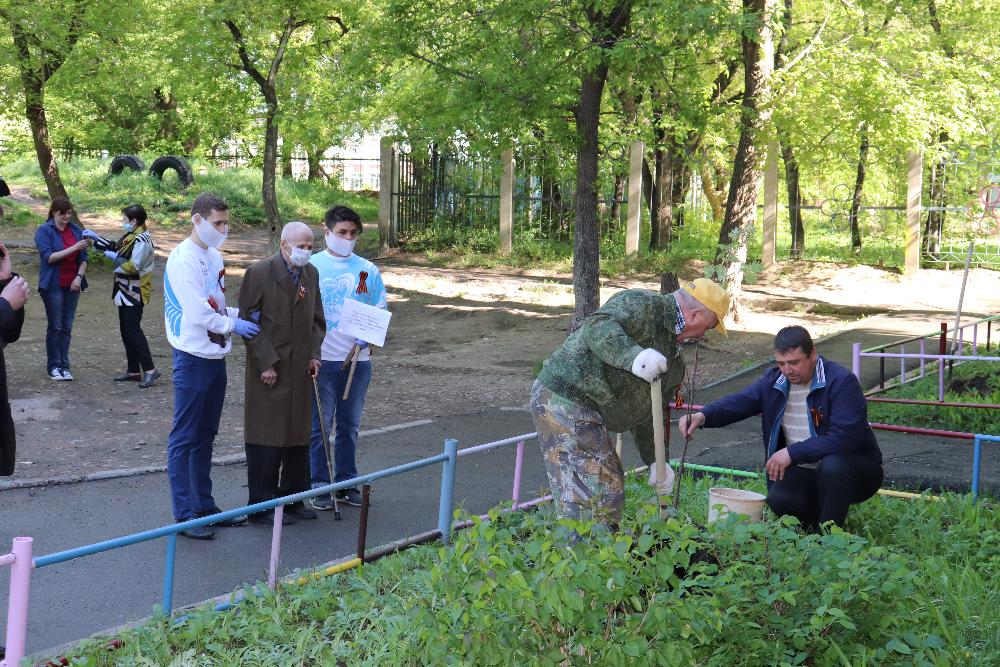 В рамках Всероссийской акции во дворах, где живут ветераны ВОВ, сотрудники администрации района, депутаты и «волонтеры Победы» высадили кусты рябины.