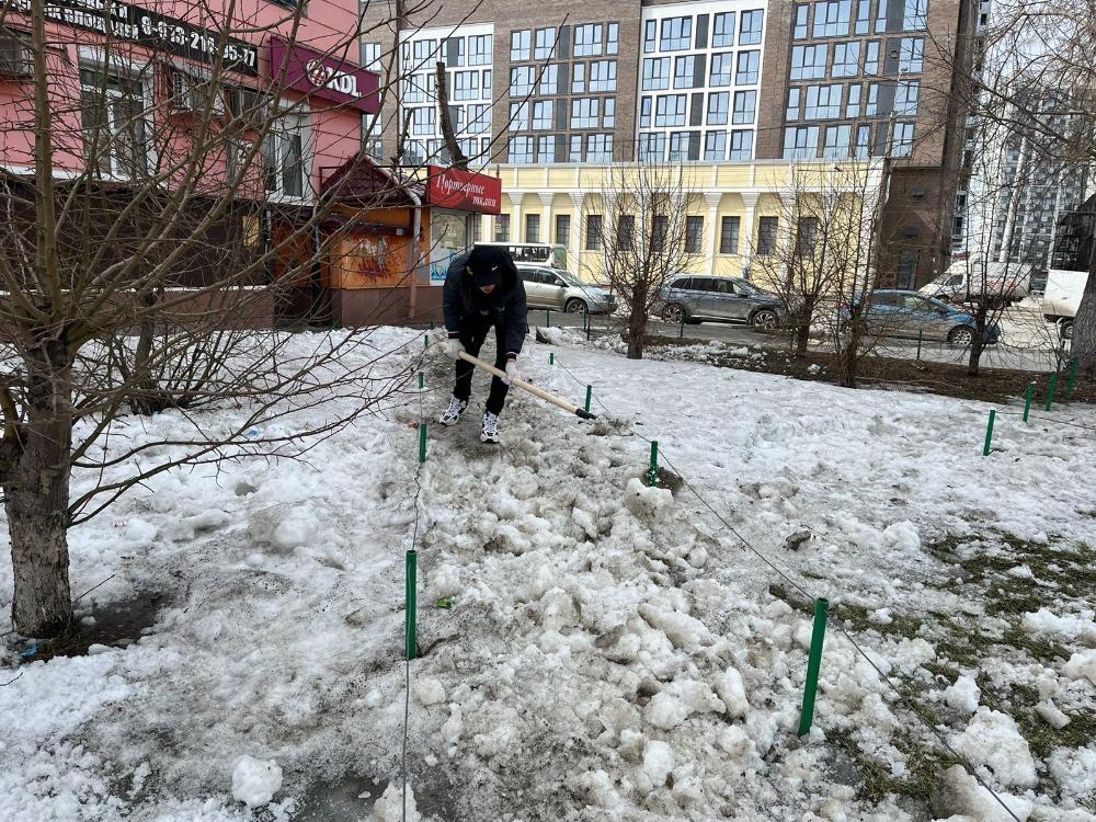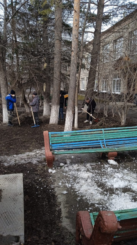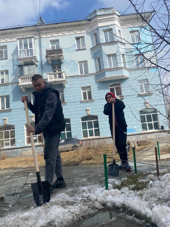 Сегодня, 2 апреля, ребята очистили от вытаявшего мусора зеленую зону вблизи здания по адресу: ул. Привокзальная, 17а и ворошили снег в сквере между домами