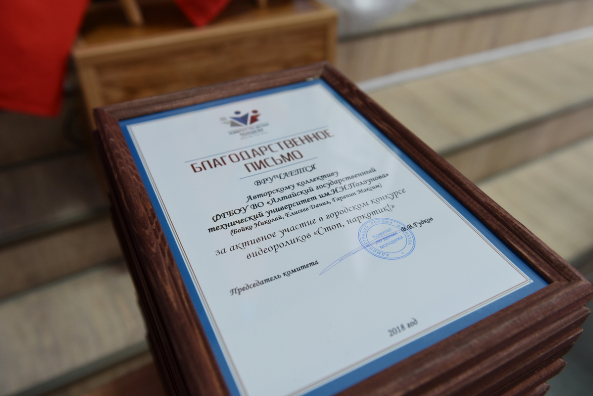 15 ноября в актовом зале Барнаульского государственного педагогического колледжа прошла торжественная церемония, посвященная подведению итогов городского социального конкурса видеороликов «СтопНаркотик!». Акция проводилась по инициативе комитета по делам молодежи администрации города при поддержке ГУ МВД России по Алтайскому краю и Краевого центра медицинской профилактики.