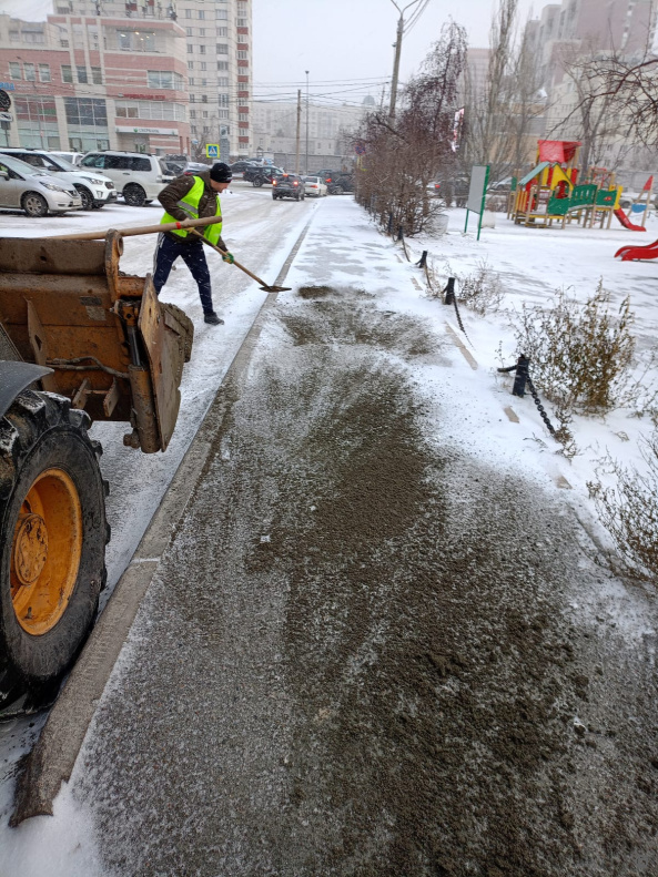 Работу по очистке придомовой территории проводят специалисты управляющих организаций. Работу по очистке прилегающих территорий и входных групп ведут торговые предприятия, расположенные на территории Железнодорожного района.