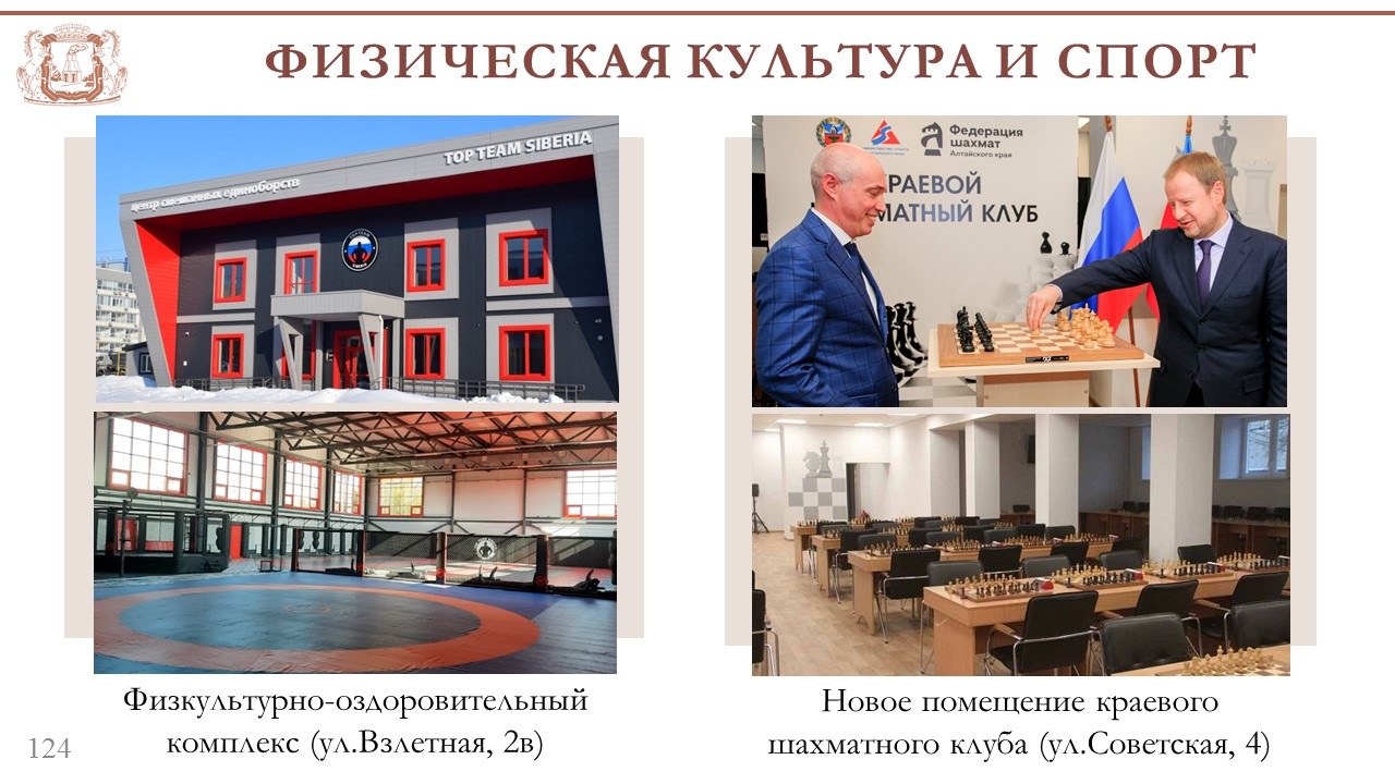 – За предыдущий год на развитие спортшкол выделено 60 миллионов рублей. Мы построили и реконструировали 19 открытых спортивных сооружений. Ведется строительство физкультурно-оздоровительных комплексов в Ленинском и Индустриальном районах. В развитии спортивной инфраструктуры активно участвуют предприниматели. Завершена реализация первой в городе социальной концессии – в Индустриальном районе построен центр смешанных единоборств, где ежедневно смогут заниматься сотни барнаульцев.