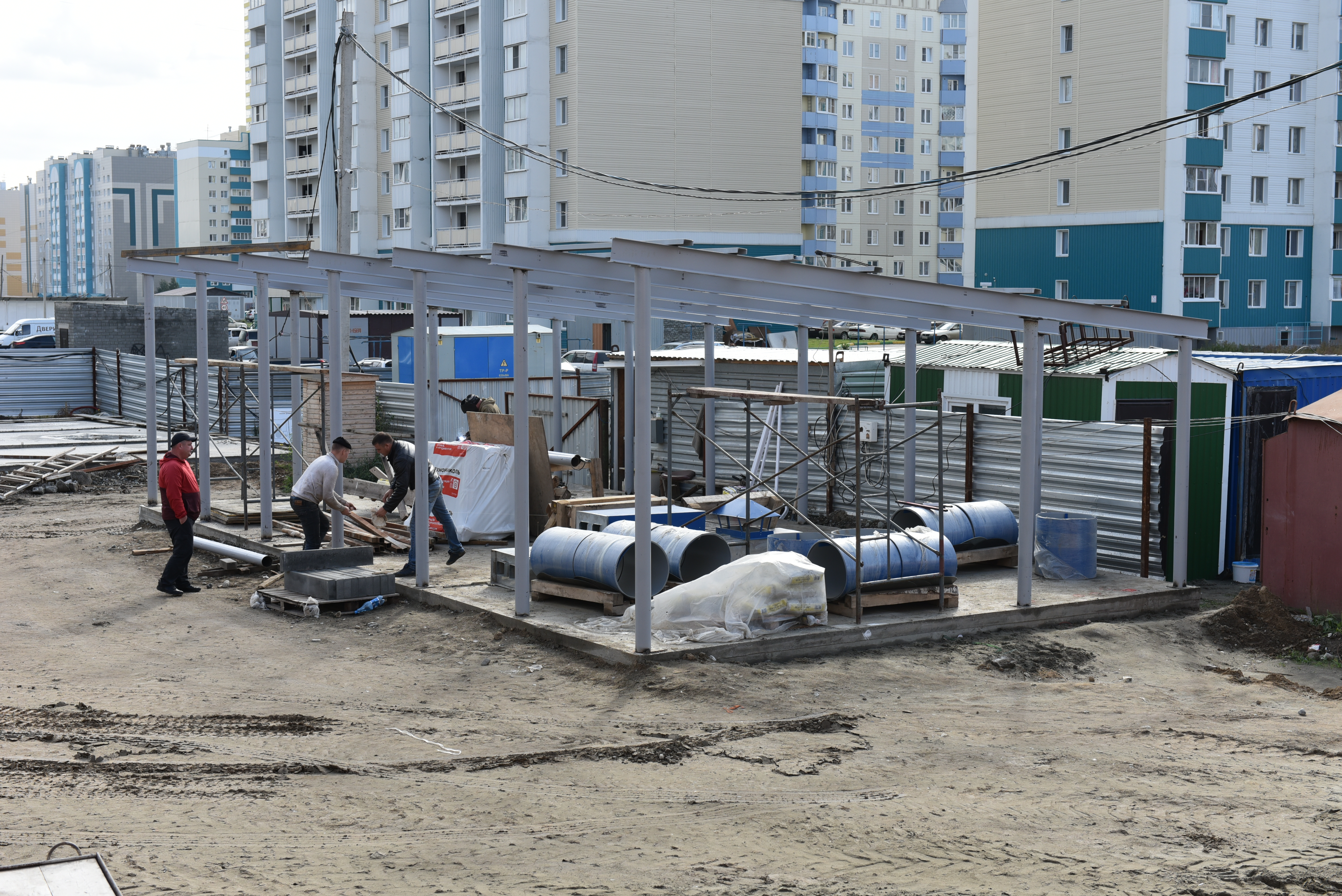 В настоящее время закончено возведение коробки здания, конструкции кровли, обрешетки, стропильной системы. Выполнено устройство наружной сети теплоснабжения. Рабочие приступили к монтажу постоянного забора, наружного освещения, устройству теневых навесов, в ближайшее время начнется укладка асфальта и тротуарной плитки.