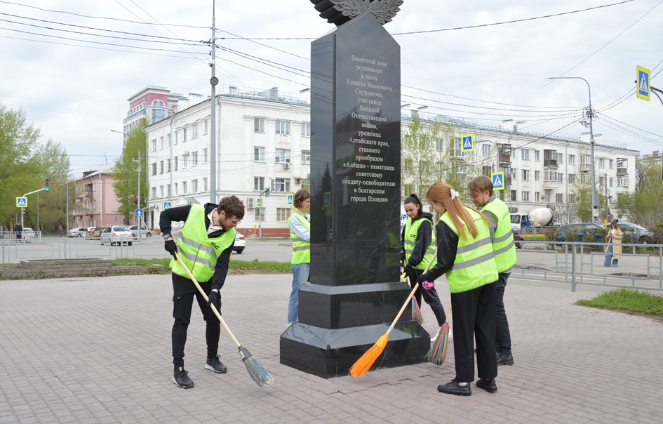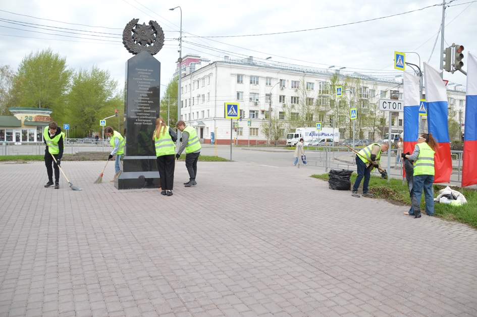 Работники компании помыли стелу, изготовленную из черного камня, подмели прилегающую территорию, очистили газон от прошлогодней листы.