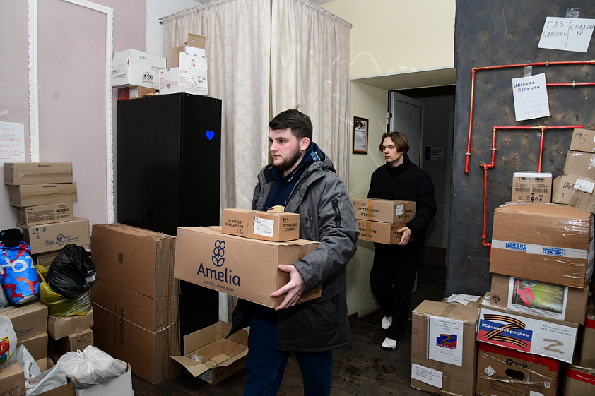 7 февраля в формировании посылок участвовали бойцы межвузовского педагогического отряда «Аврора». Ребята собирали коробки, раскладывали в них принесённые горожанами подарки, аккуратно упаковывали посылки с наклейками «Совет женщин Барнаула».