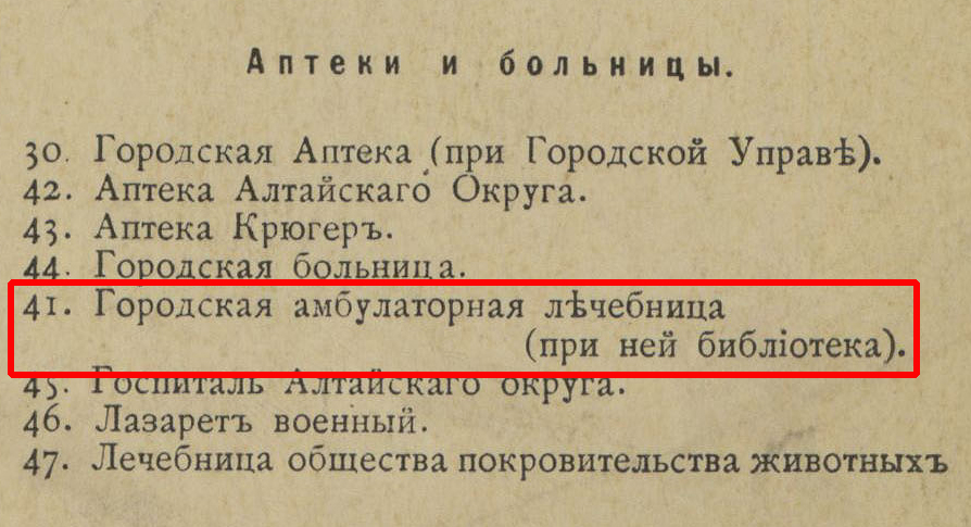 Чтобы убедиться в назначении постройки, достаточно взглянуть на план Барнаула 1907 года. В то время улица Никитина носила название Бийская. В документе отмечено, что в здании на улице Бийской под номером 41 располагается городская амбулаторная лечебница (при ней - библиотека).