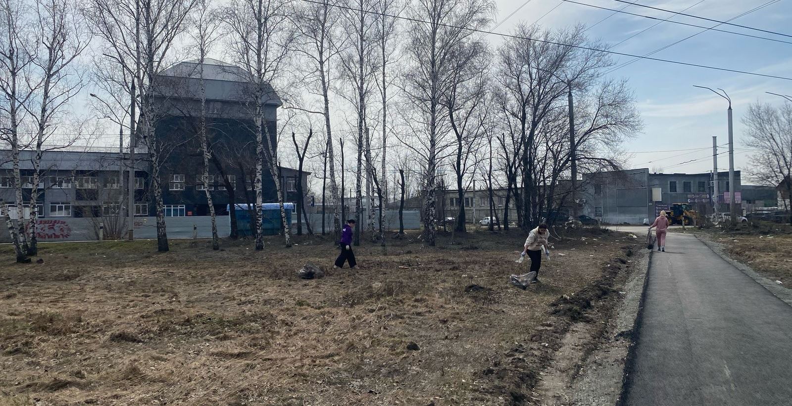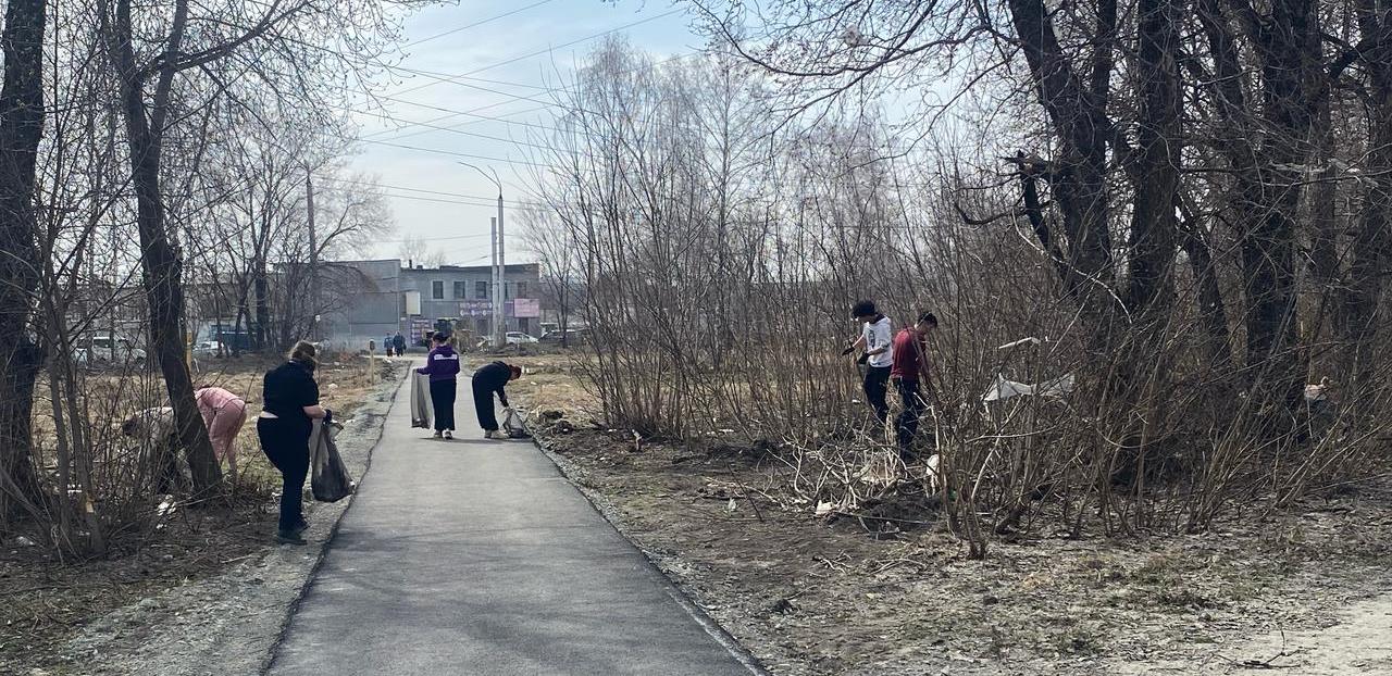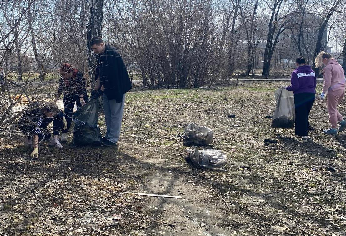 Ребята собирали ветки и вытаявший мусор на пересечении пр-кта Космонавтов и ул.Малахова.