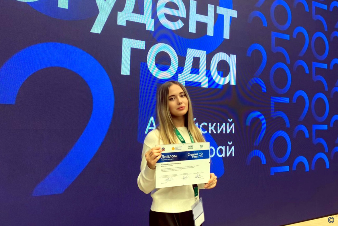 В Барнауле прошло награждение лауреатов регионального этапа Российской национальной премии «Студент года-2025», среди которых – студентка 4 курса Экономического факультета Алтайского государственного аграрного университета Анна Минина.