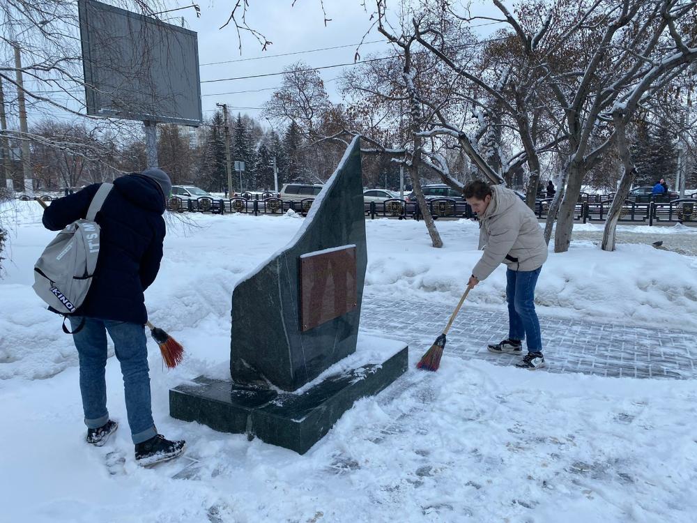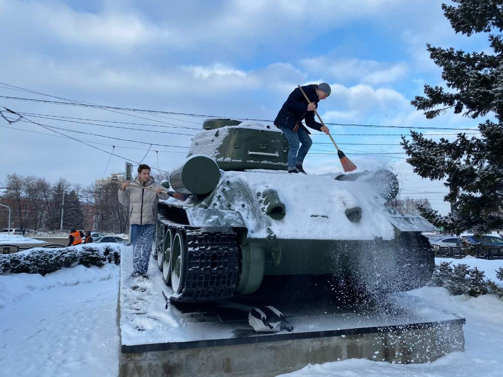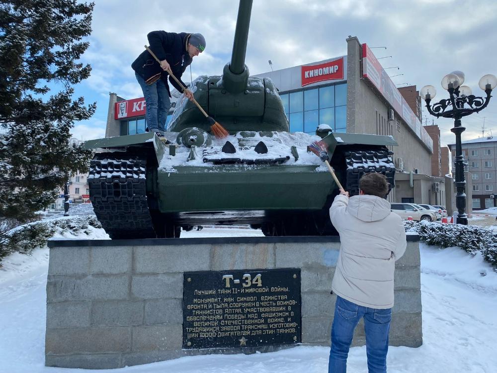 Так, 22 февраля учащиеся Алтайского государственного колледжа очистили от снега памятник лучшему танку времен Великой Отечественной войны Т-34 и памятному знаку в честь защитников Сталинграда.