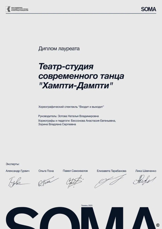 Отметим, фестиваль собрал сорок детских хореографических коллективов со всей России. Жюри предстояло выбрать лишь десять лучших постановок, и спектакль «Хампти-Дампти» «Входит и выходит» оказался в их числе. Именно за эту работу театр был удостоен престижной фестивальной премии.