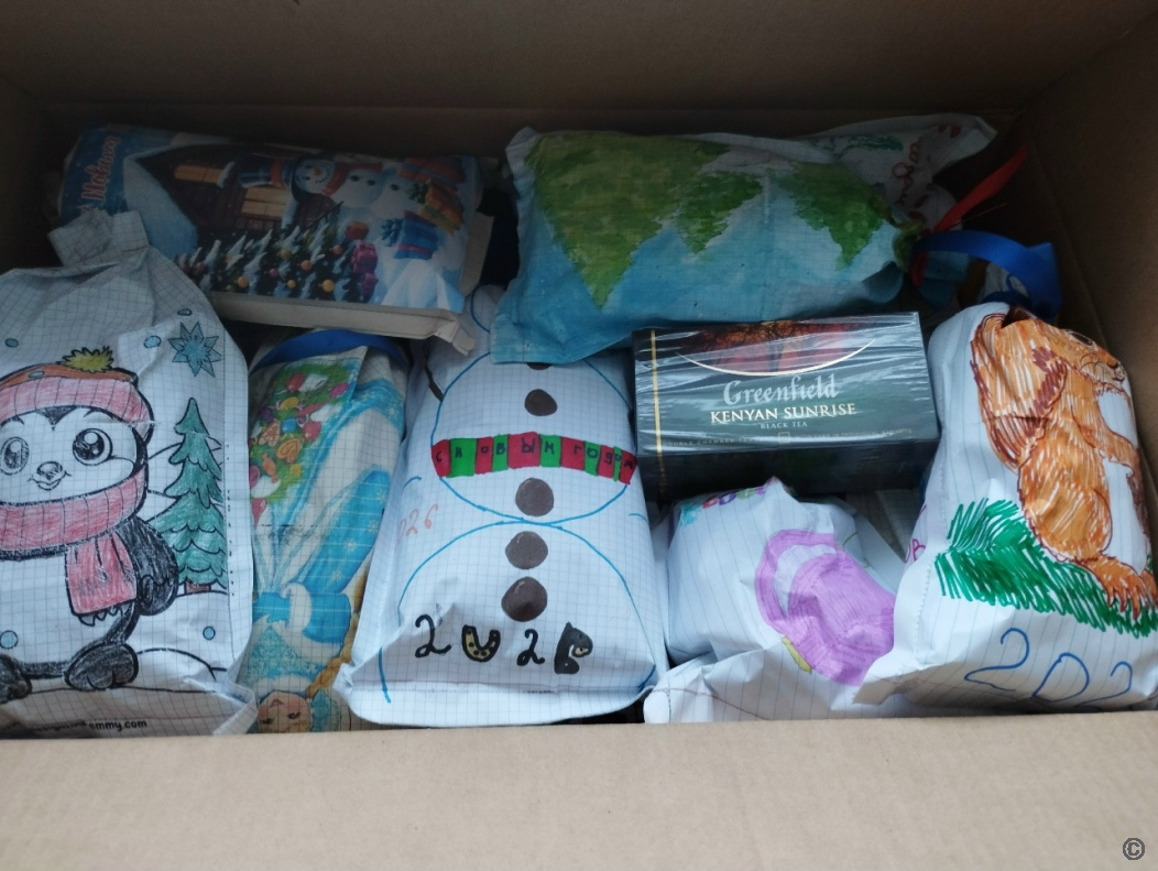 В рамках акции участники движения «Орлята России» изготовили новогодние бумажные кульки, оформили их рисунками и поздравительными надписями для военнослужащих — участников специальной военной операции. Школьники наполнили кульки сладостями, чаем, кофе и печеньем.