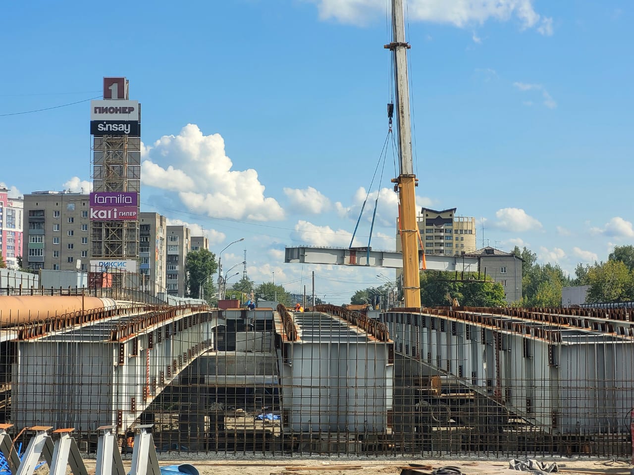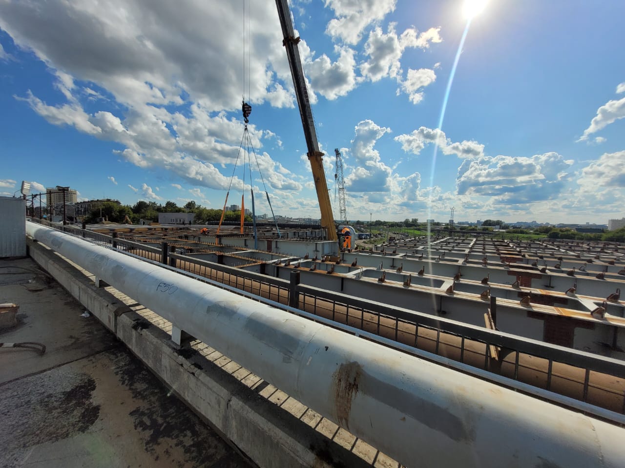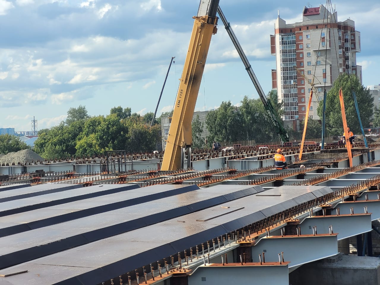 Так, в выходные строители завершили монтаж самого большого пролета между третьей и четвертой опорами большого путепровода.