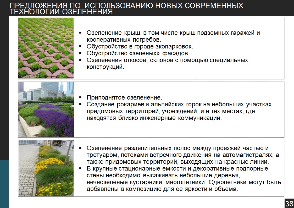 увеличение озеленения крыш и зон подземных гаражей и кооперативных погребов, создание экопарковок, зеленых фасадов, создание рокариев и альпийских горок;