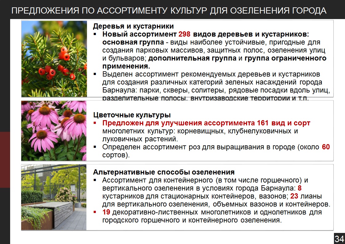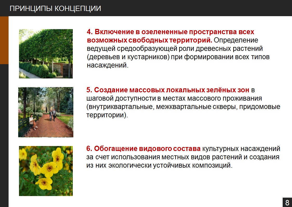 «Это касается применения подходов к выбору различных посадочных культур деревьев, цветочной рассады. Например, в этом году мы постепенно будем использовать посадку именно многолетних культур цветочной рассады. Также в рамках новой концепции рассматривается благоустройство центральной аллеи на проспекте Ленина».