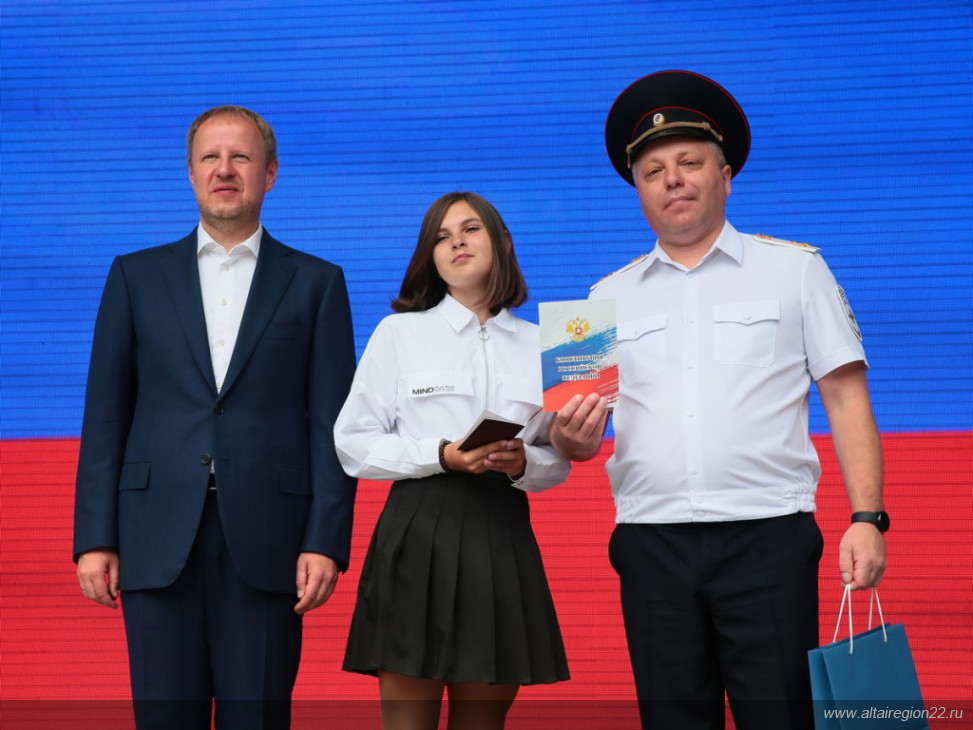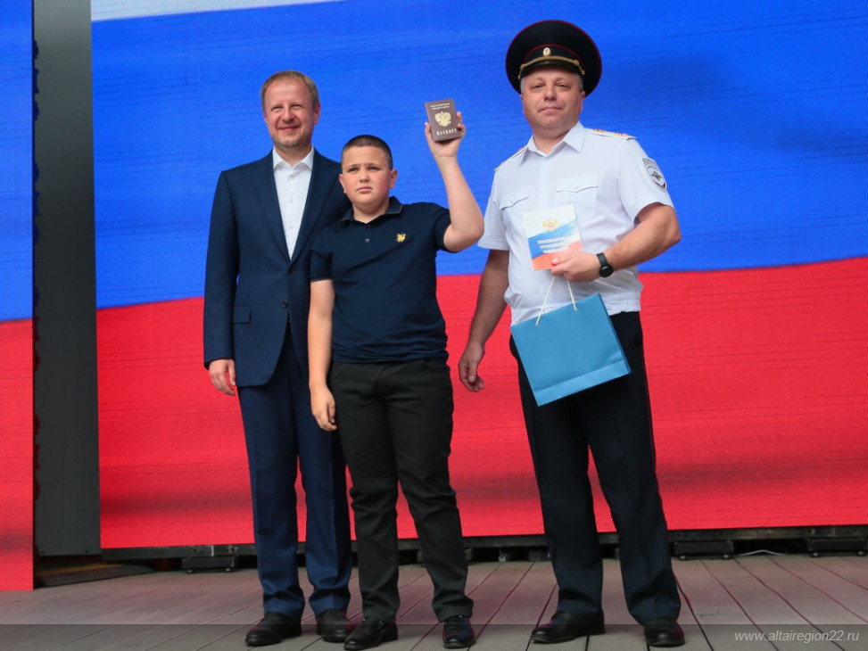 День России в этом году запомнится не только участникам фестиваля и его зрителям. Особым он стал для ребят, которые сегодня получили паспорта. Главный документ гражданина Российской Федерации шести подросткам вручили Губернатор Виктор Томенко и начальник управления по вопросам миграции Главного управления МВД России по Алтайскому краю Андрей Самойлов. Ребята также получили подарки с символикой Алтайского края.