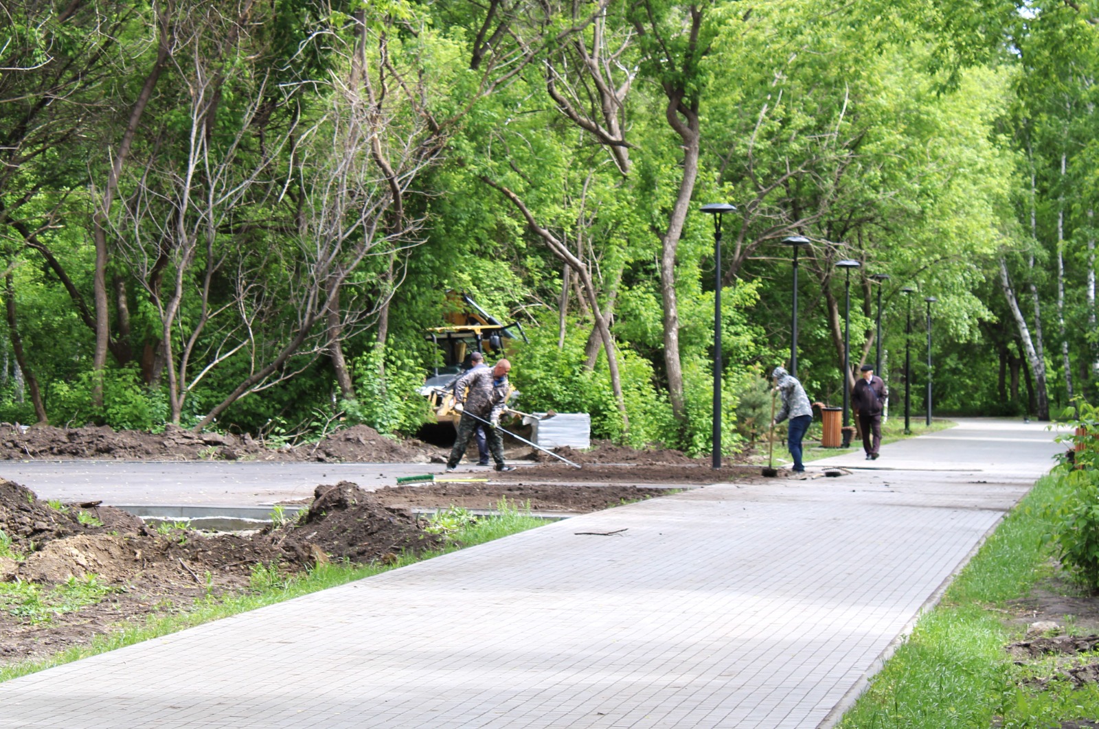 Также рабочие прокладывают новые пешеходные дорожки, устраивают поребрик, укладывают плитку. На территории будущих площадок обустраивают покрытие.
